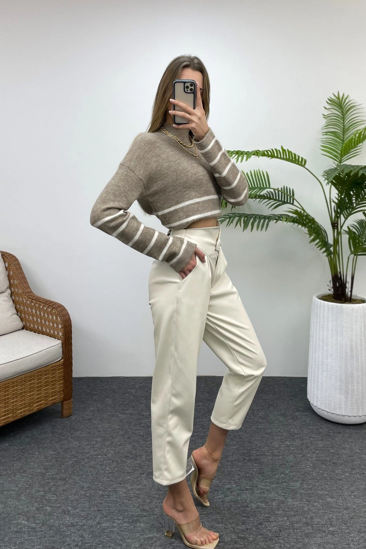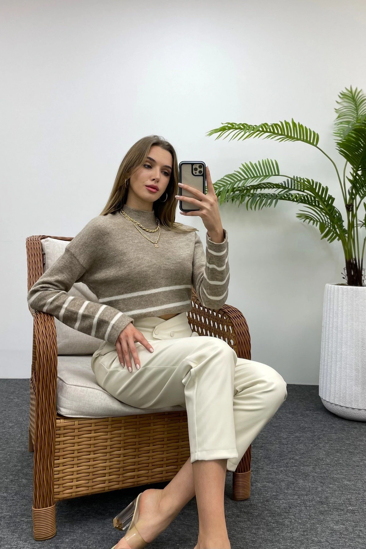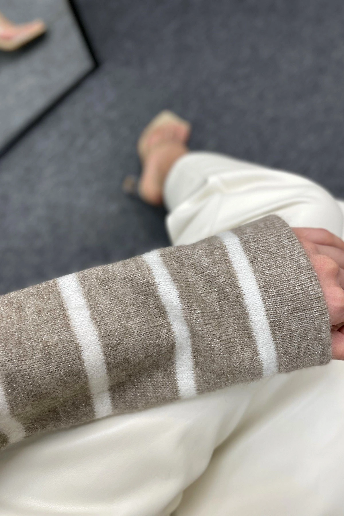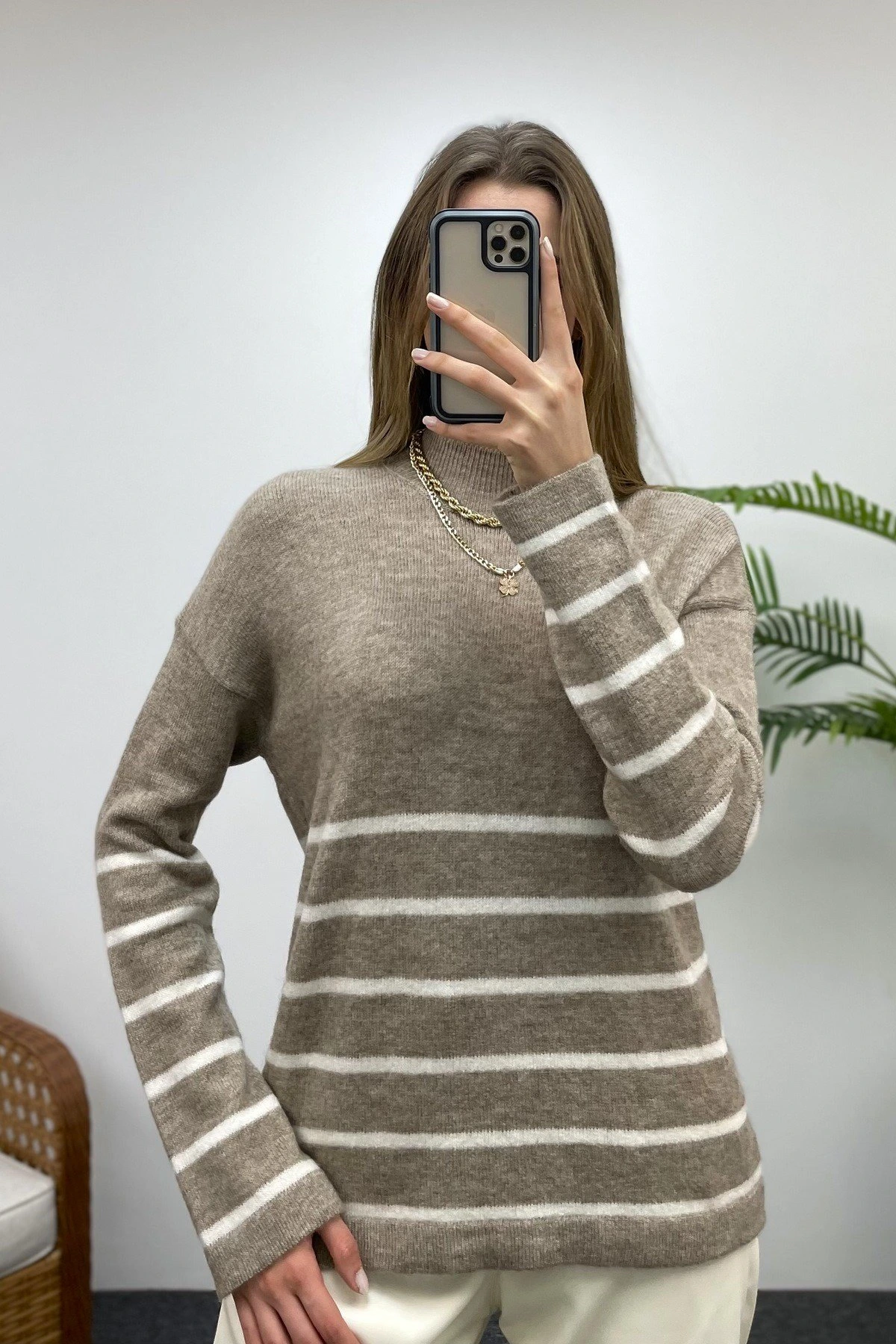 DİK YAKA ÇİZGİLİ KAZAK – KUM