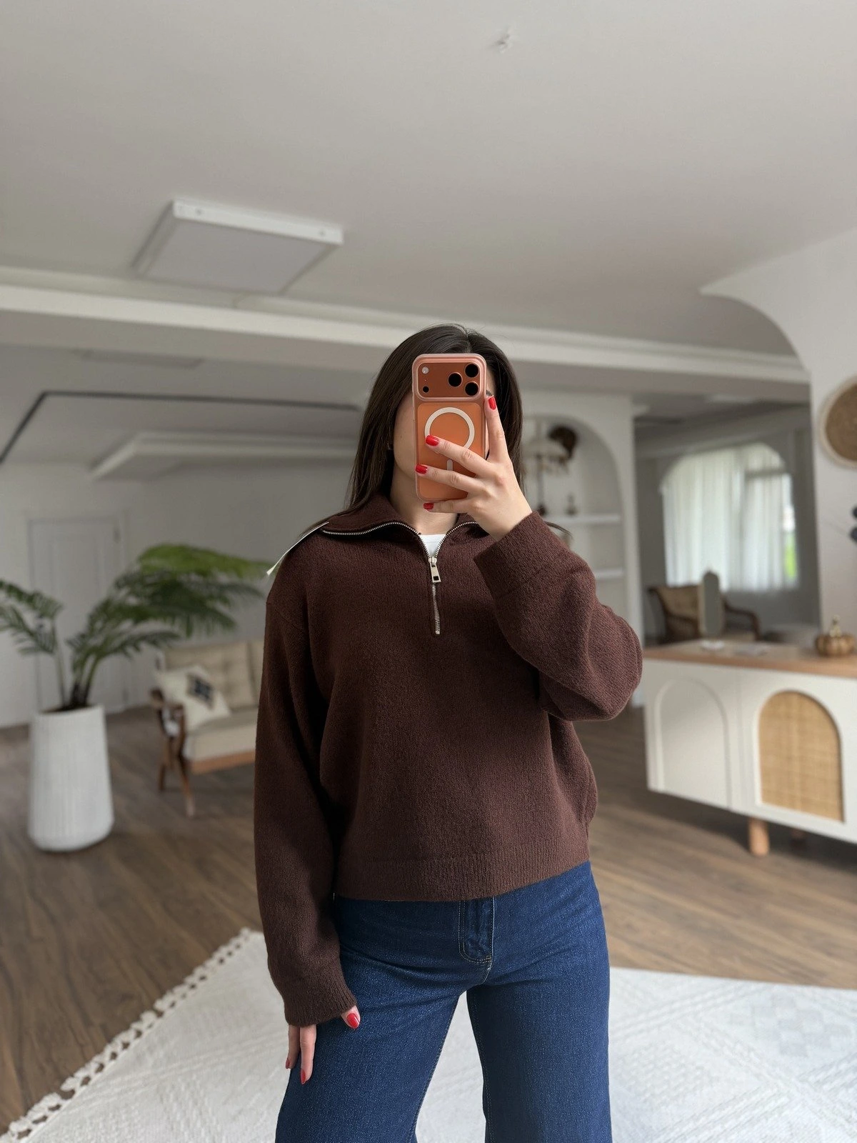 DİK YAKA FERMUARLI KAZAK – KAHVE