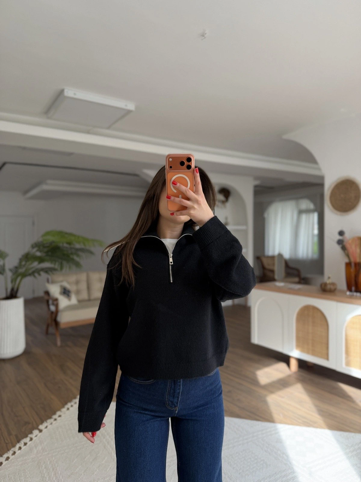 DİK YAKA FERMUARLI KAZAK – SİYAH