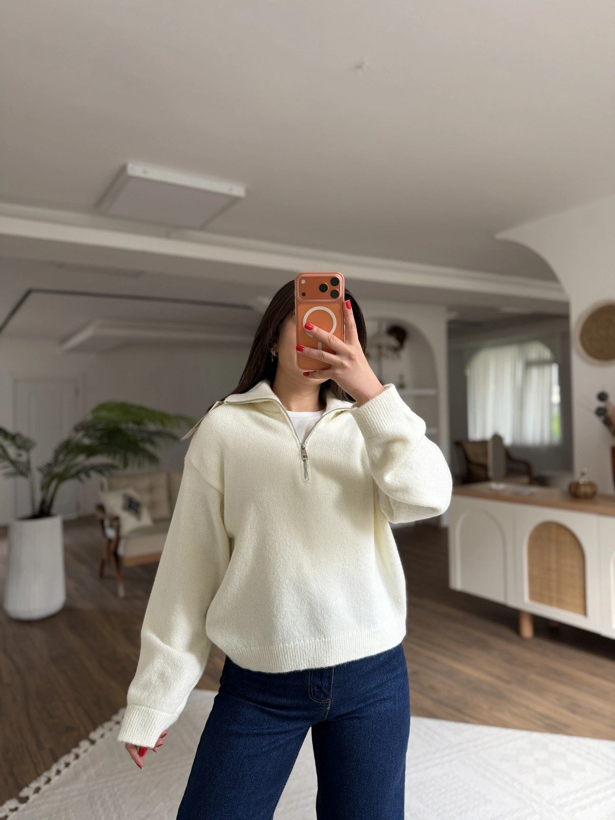 DİK YAKA FERMUARLI KAZAK – VANİLYA