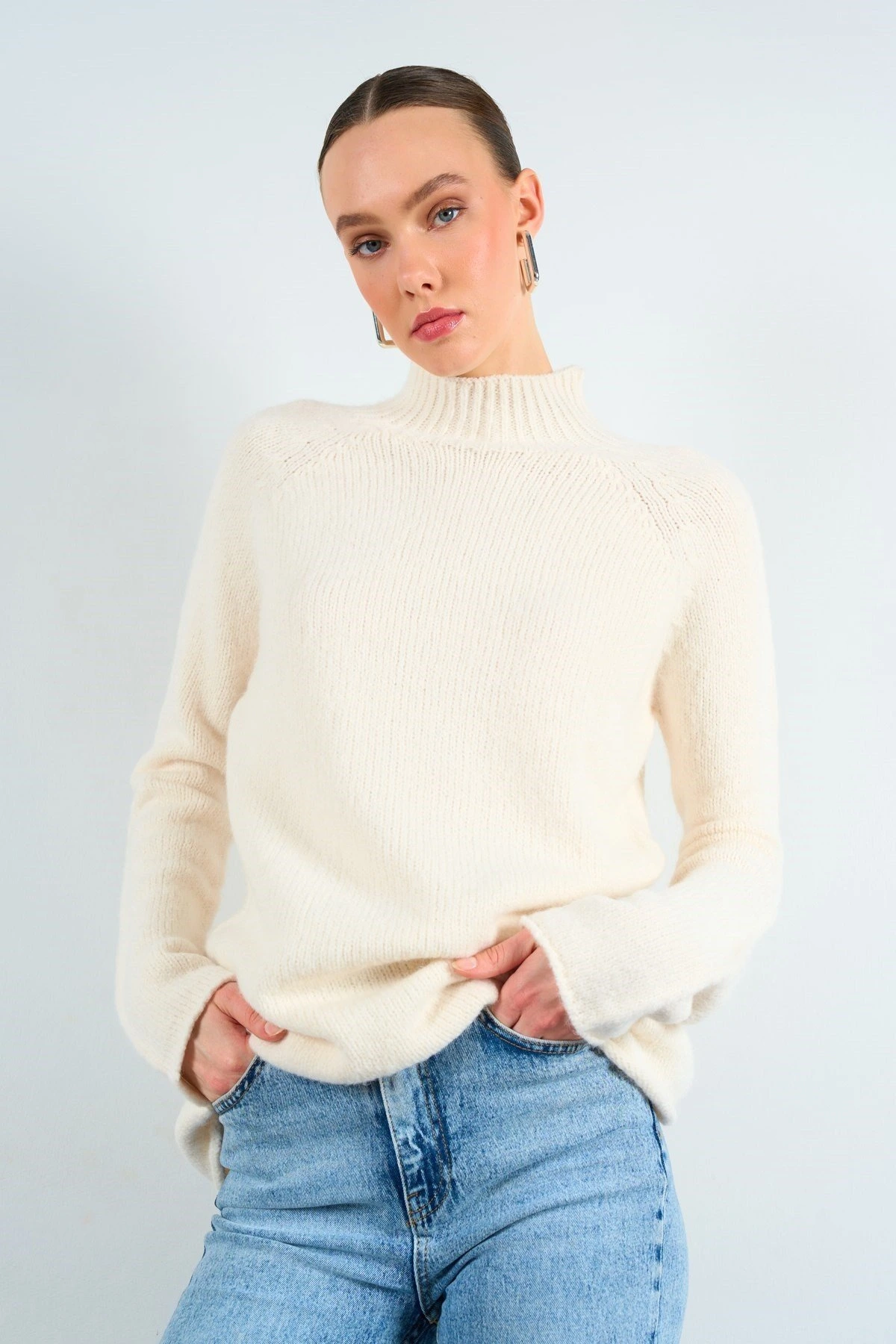 DİK YAKA REGLAN KOL SALAŞ KAZAK – KREM