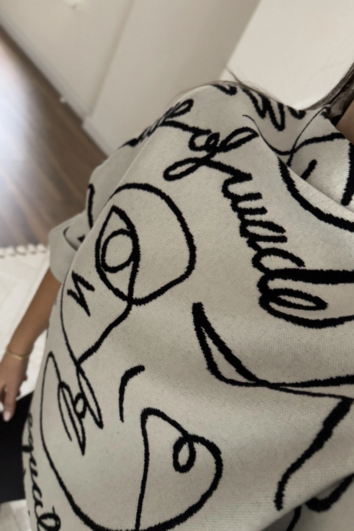 DİK YAKA YÜZ VE YAZI DESEN VİSKON DUBLE KOL KAZAK – TAŞ SİYAH