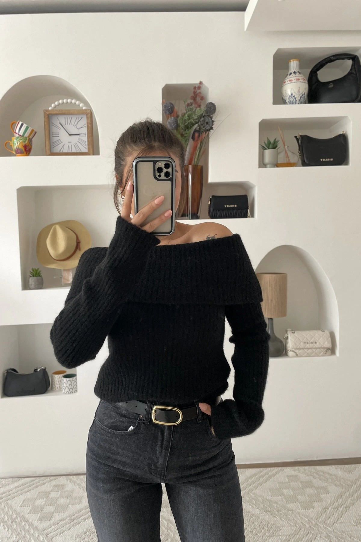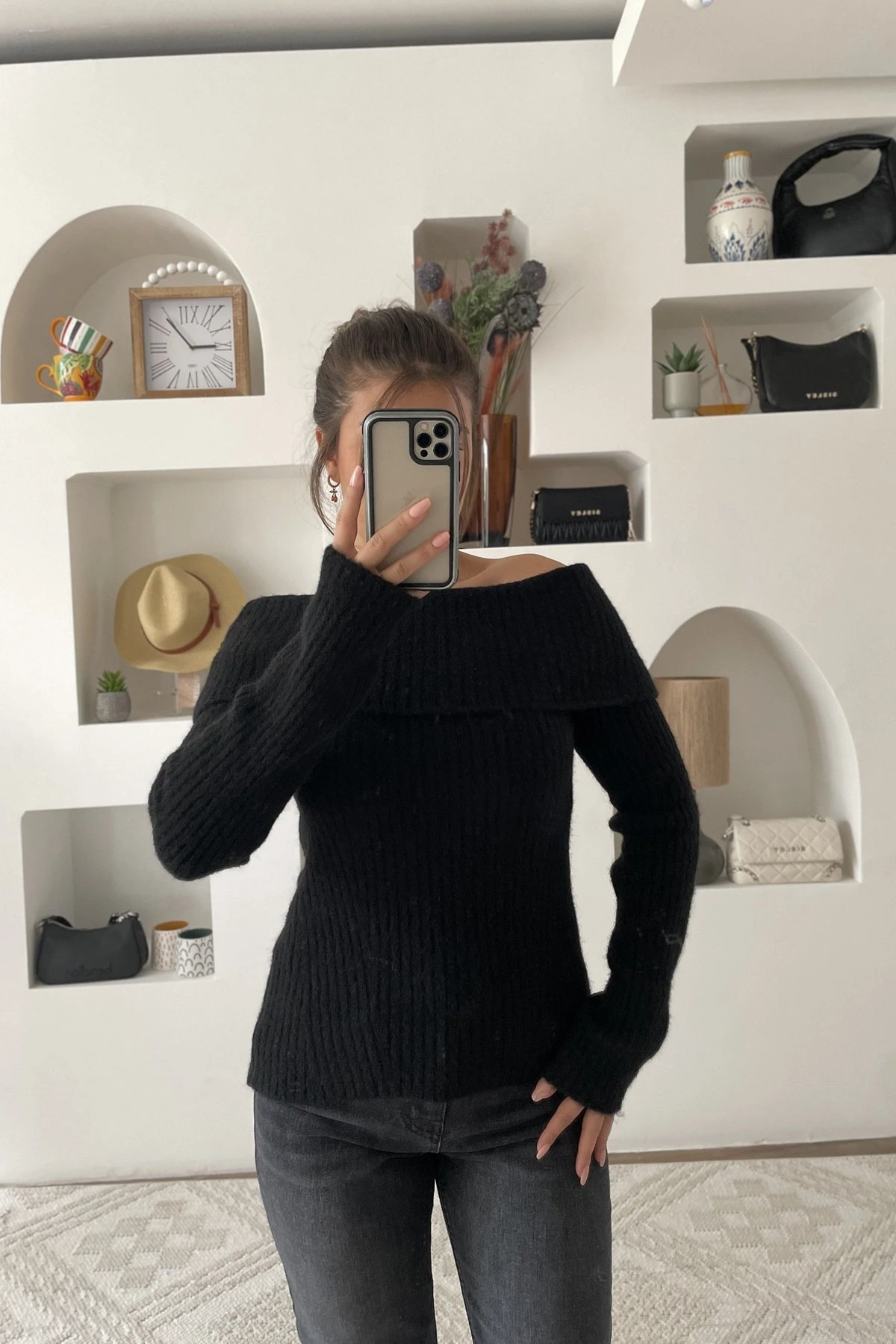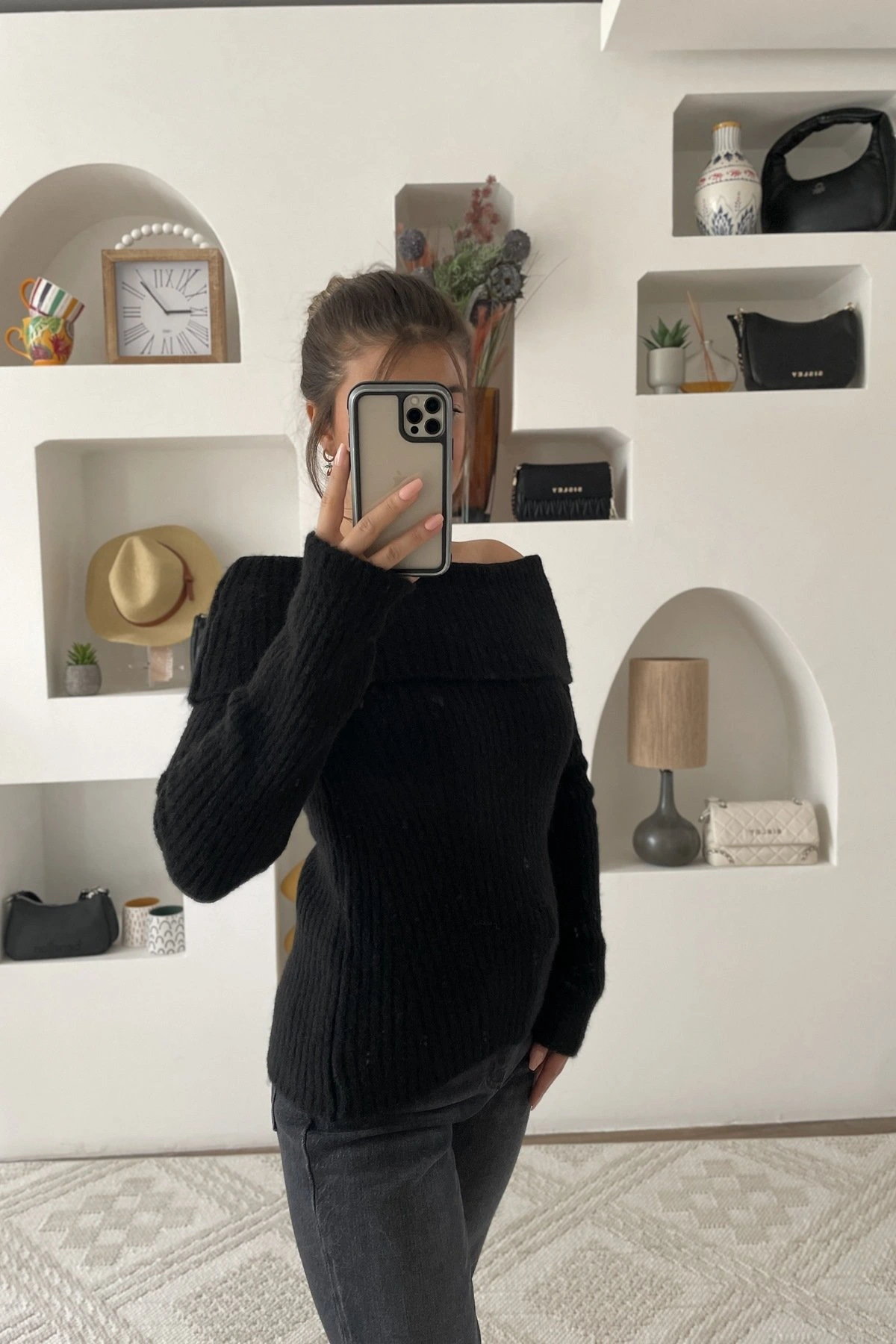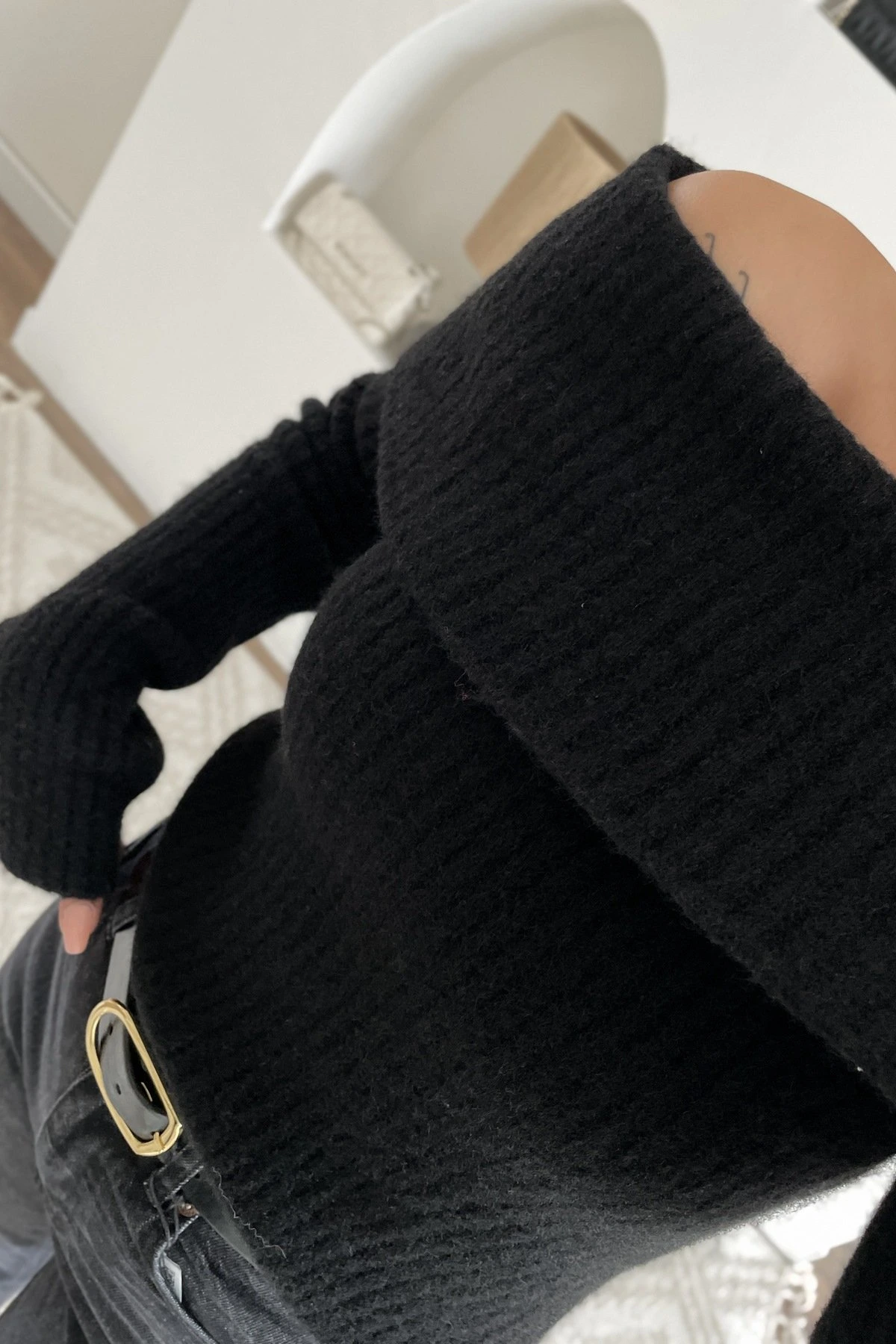 DÜŞÜK OMUZ FİTİLLİ YÜN KARIŞIM KAZAK – SİYAH
