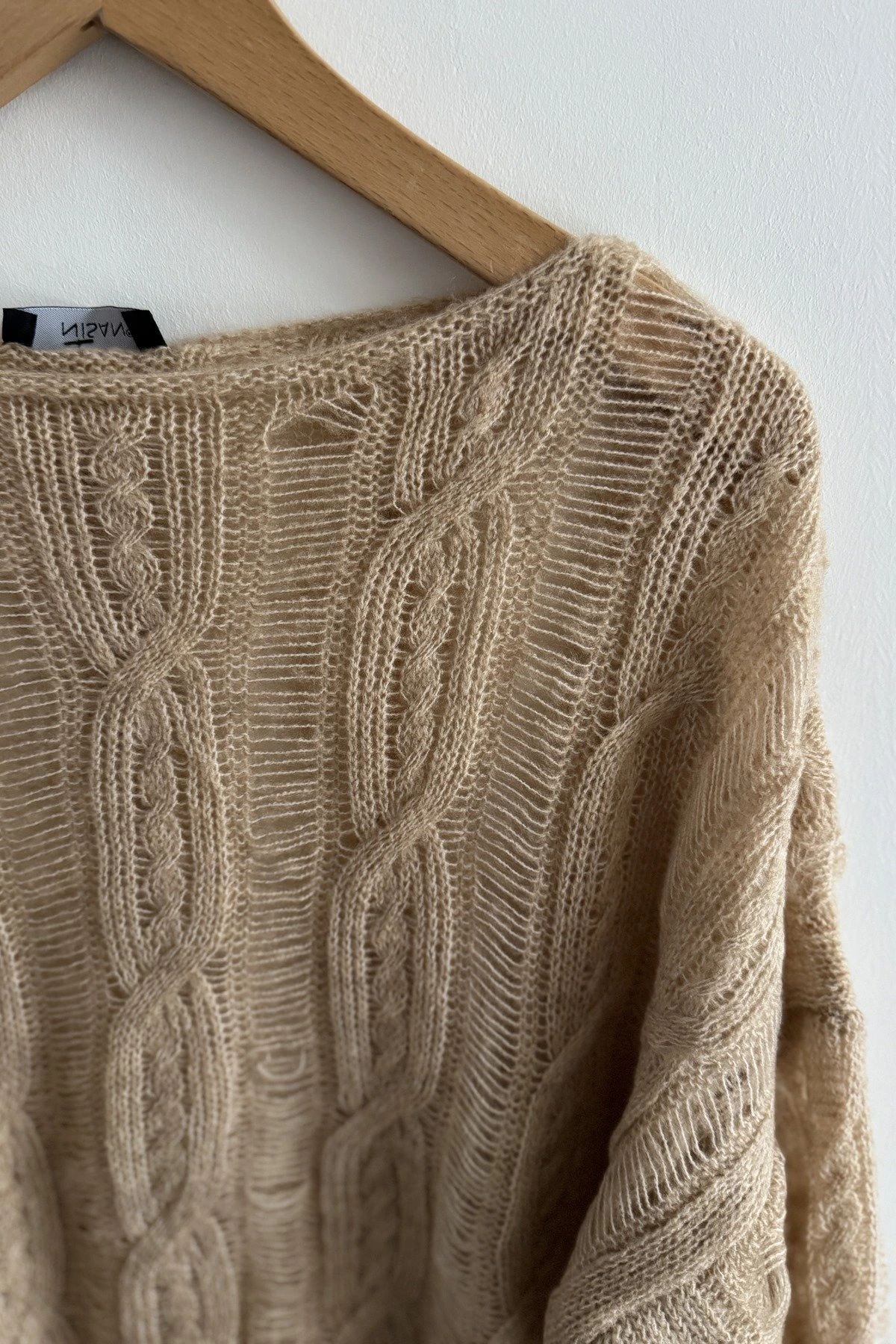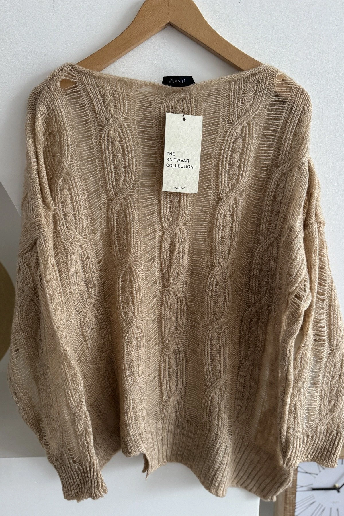 ETEĞİ ASİMETRİ SAÇ ÖRGÜ AJURLU KAZAK – BEJ