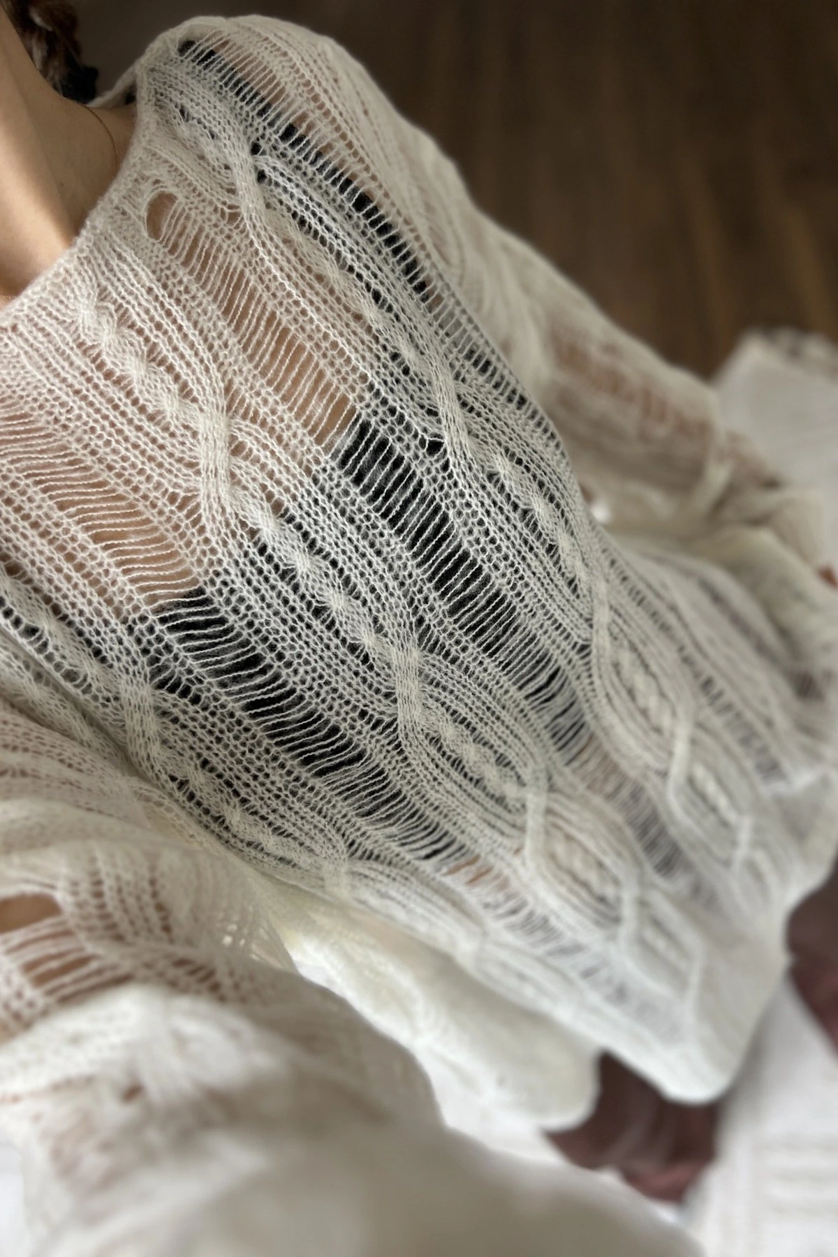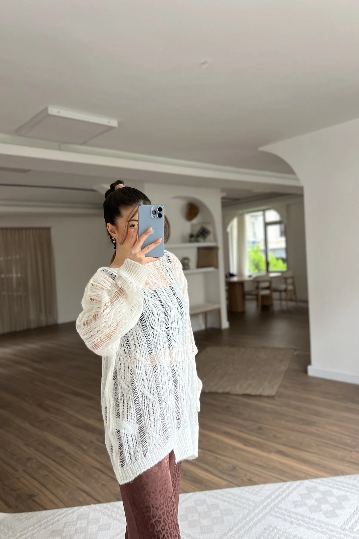 ETEĞİ ASİMETRİ SAÇ ÖRGÜ AJURLU KAZAK – EKRU