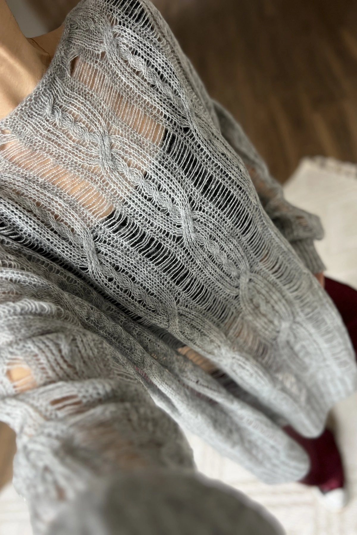 ETEĞİ ASİMETRİ SAÇ ÖRGÜ AJURLU KAZAK – GRİ