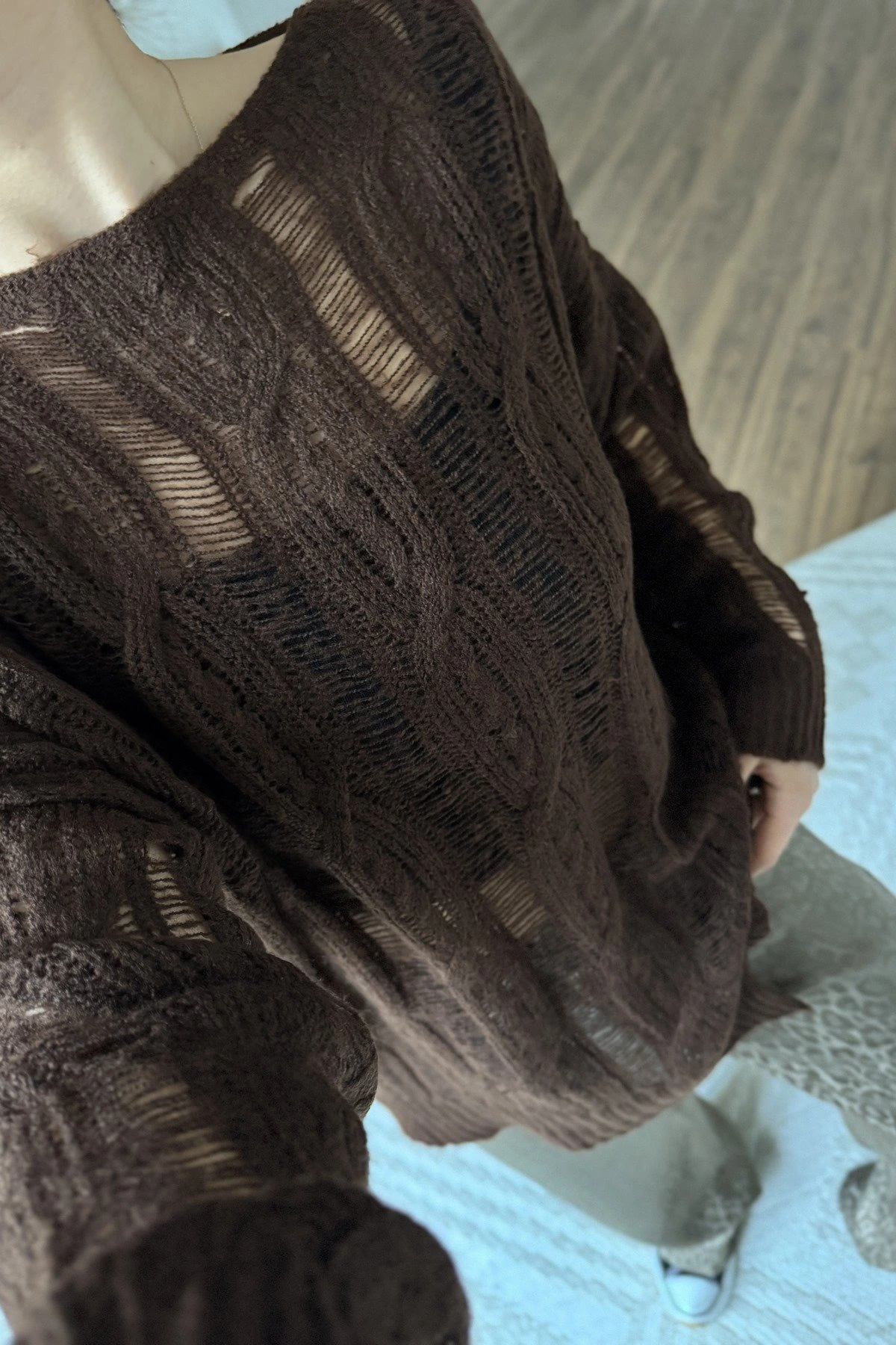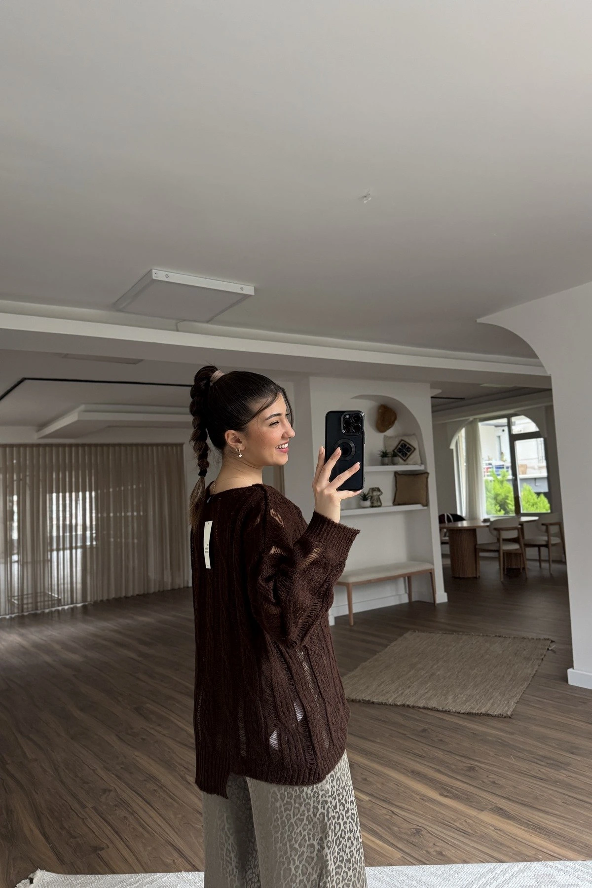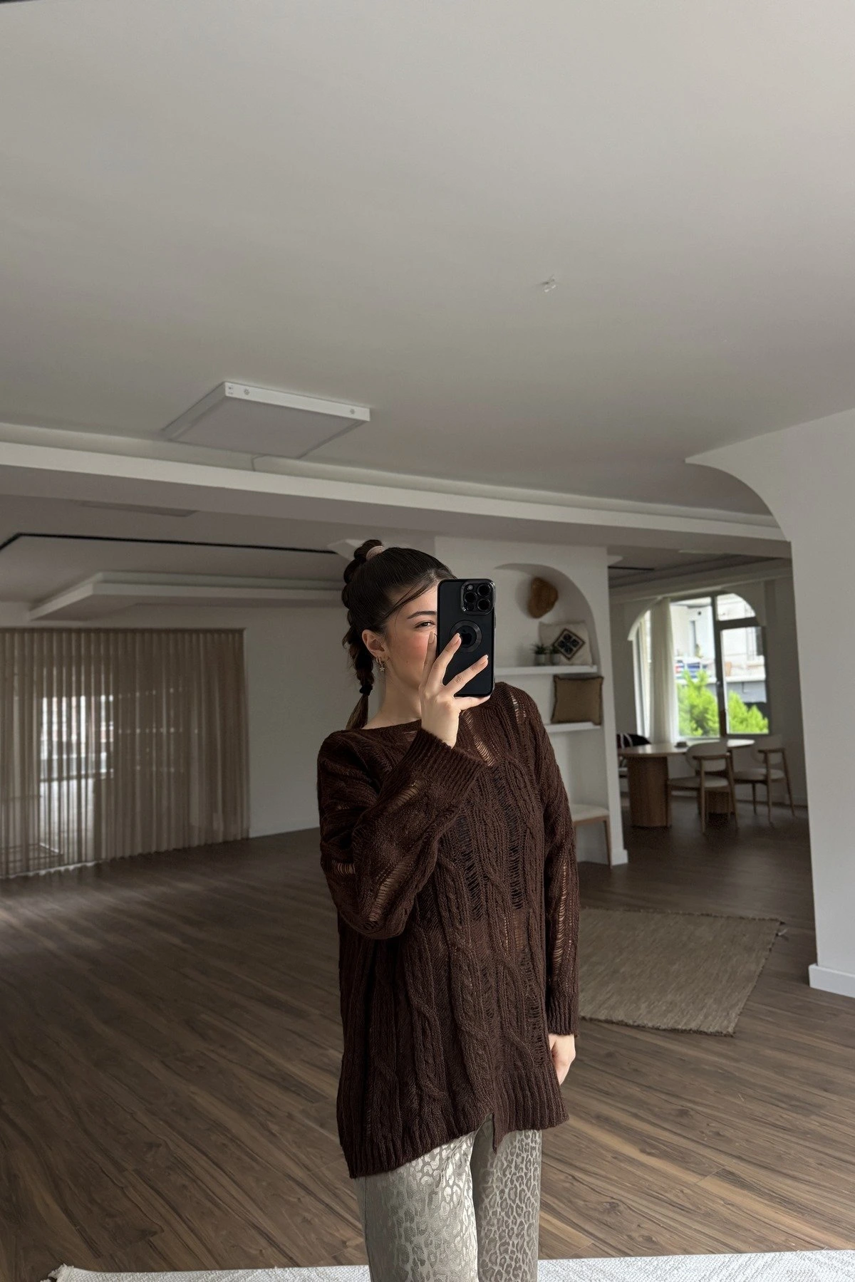 ETEĞİ ASİMETRİ SAÇ ÖRGÜ AJURLU KAZAK – KAHVE