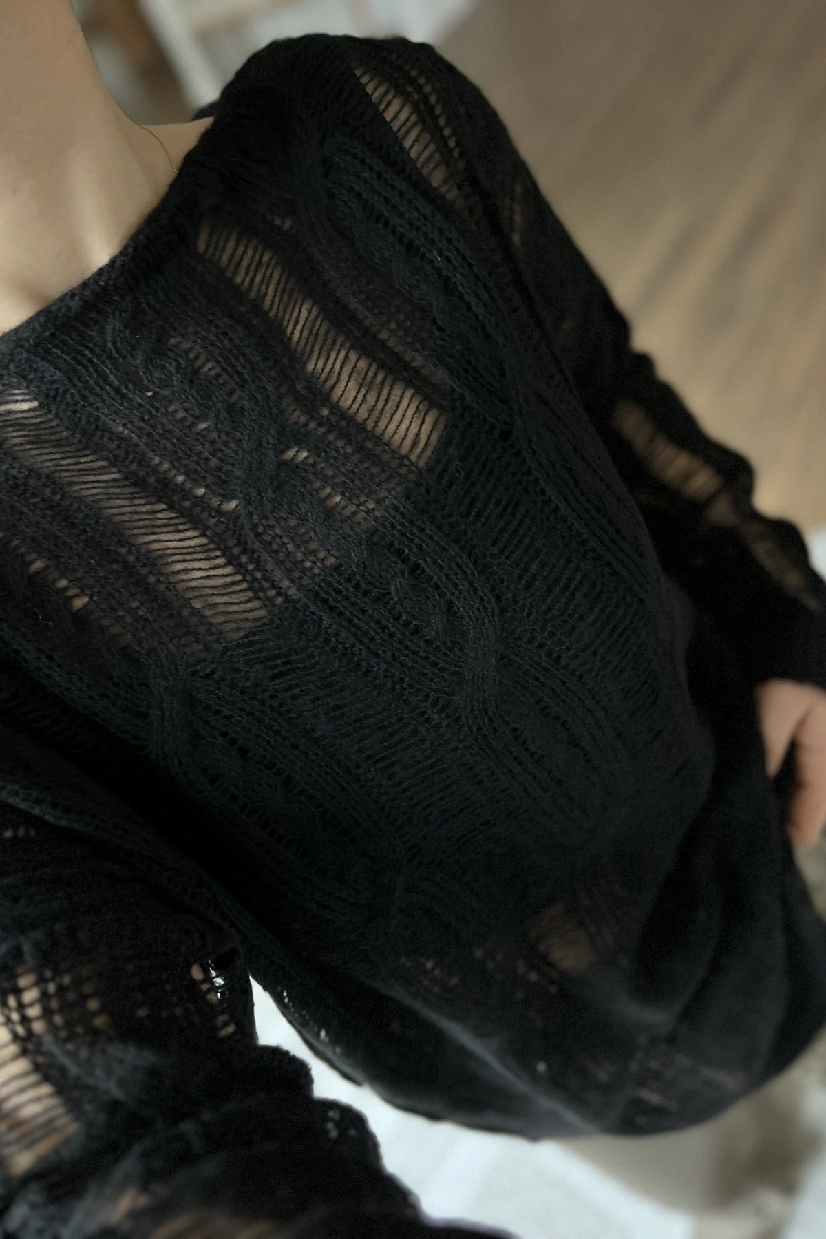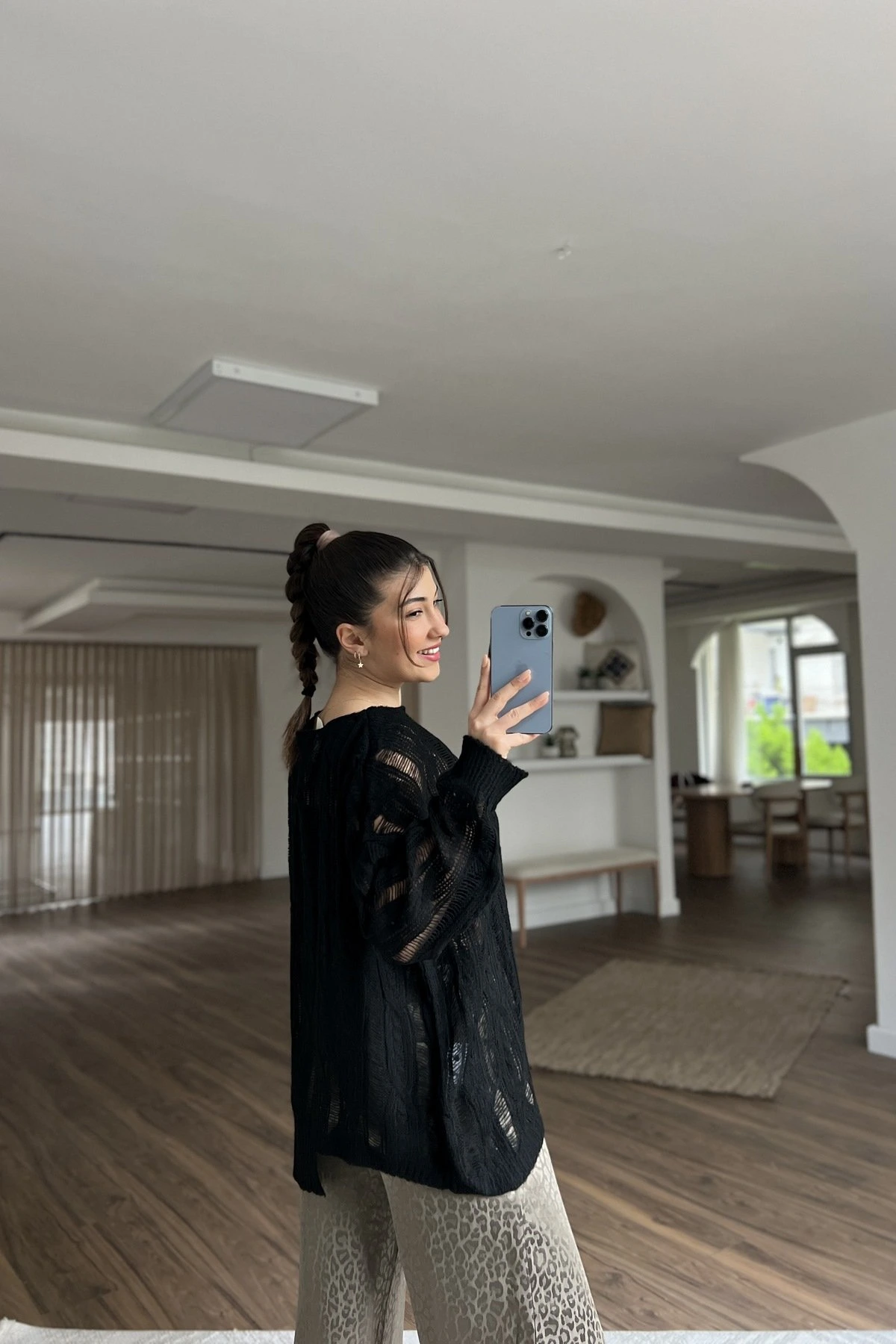 ETEĞİ ASİMETRİ SAÇ ÖRGÜ AJURLU KAZAK – SİYAH