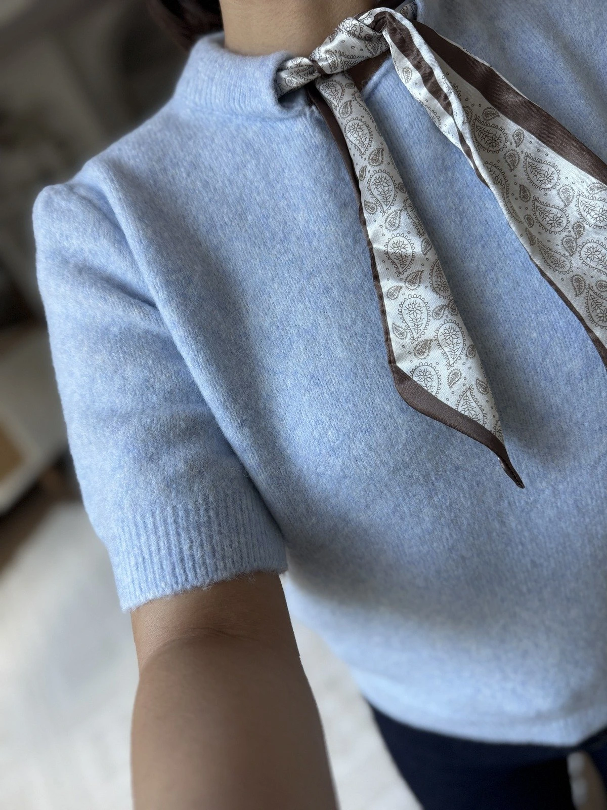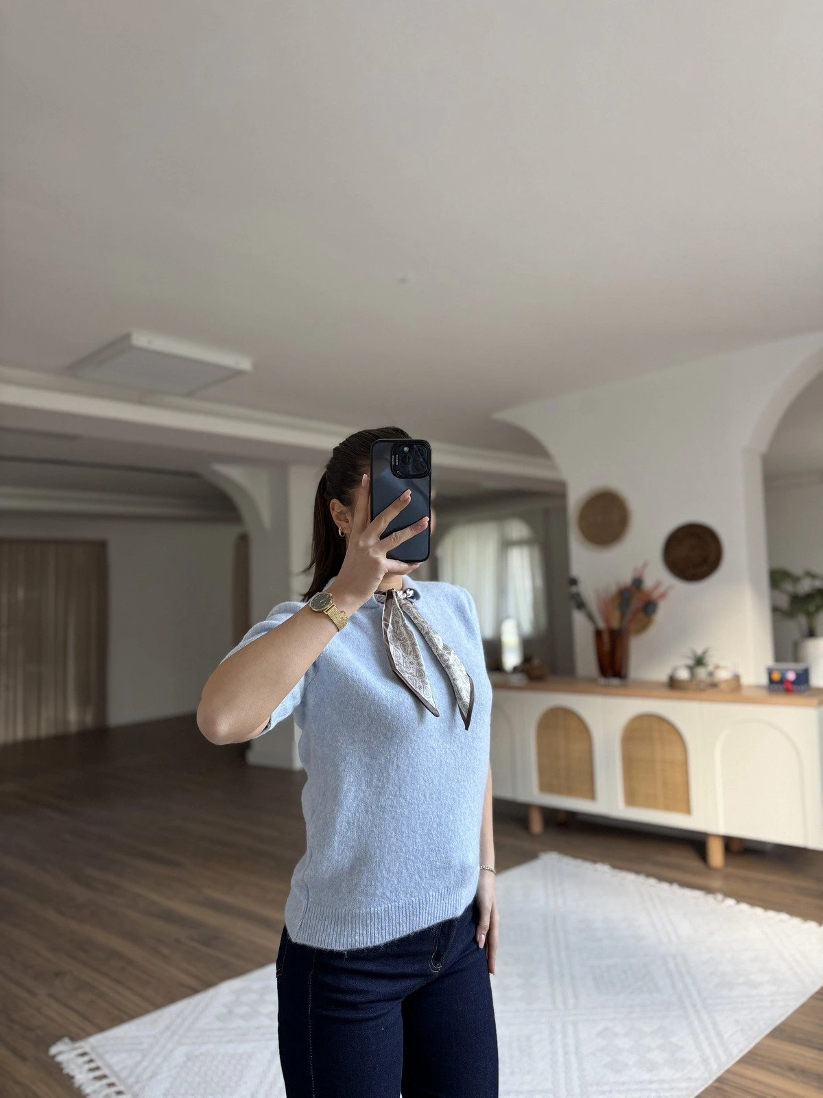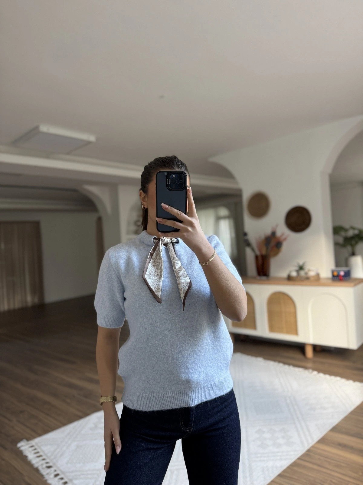 FULARLI KISA KOL YÜN KARIŞIM KAZAK – MAVİ
