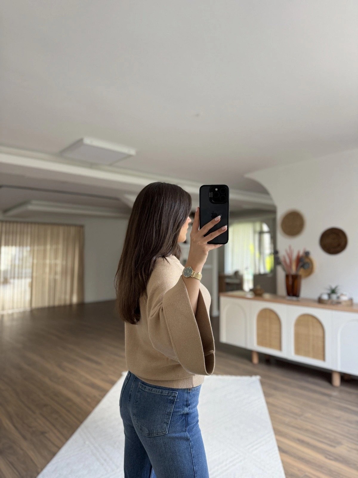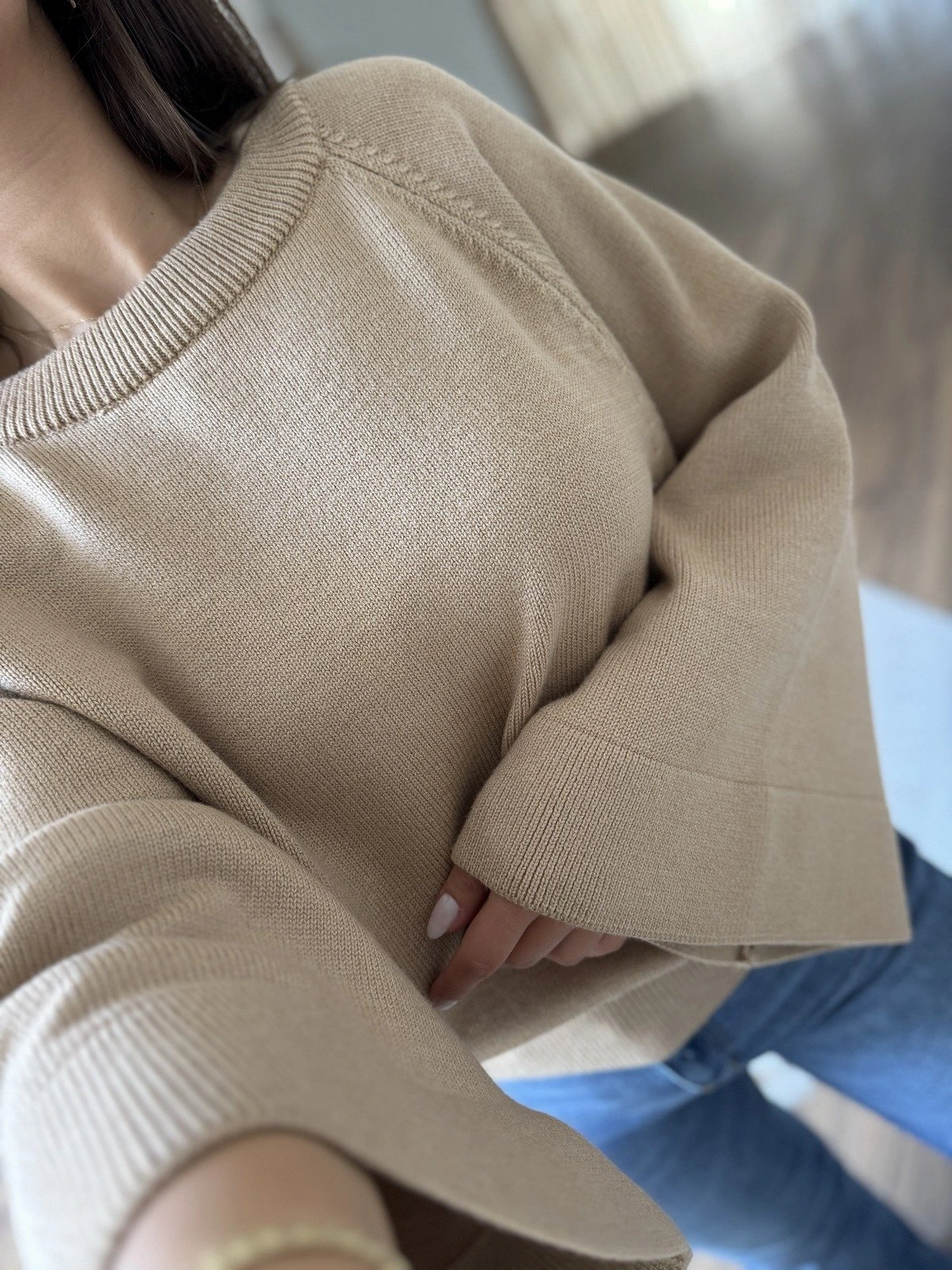 GENİŞ KOL REGLAN KOL DÖKÜMLÜ VİSKON KAZAK – KOYU BEJ