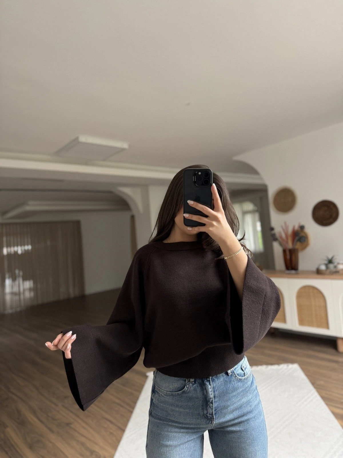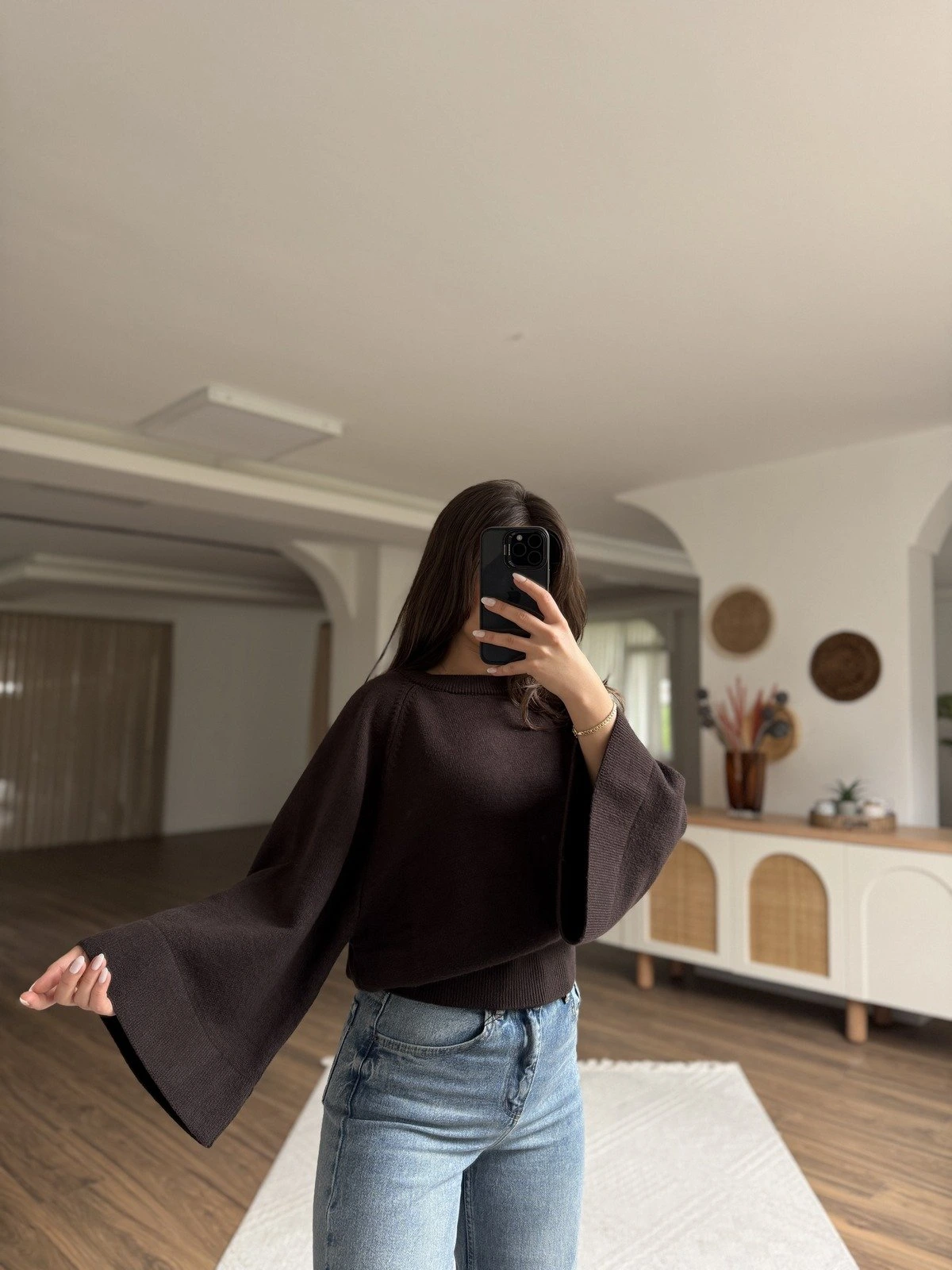 GENİŞ KOL REGLAN KOL DÖKÜMLÜ VİSKON KAZAK – KOYU KAHVE