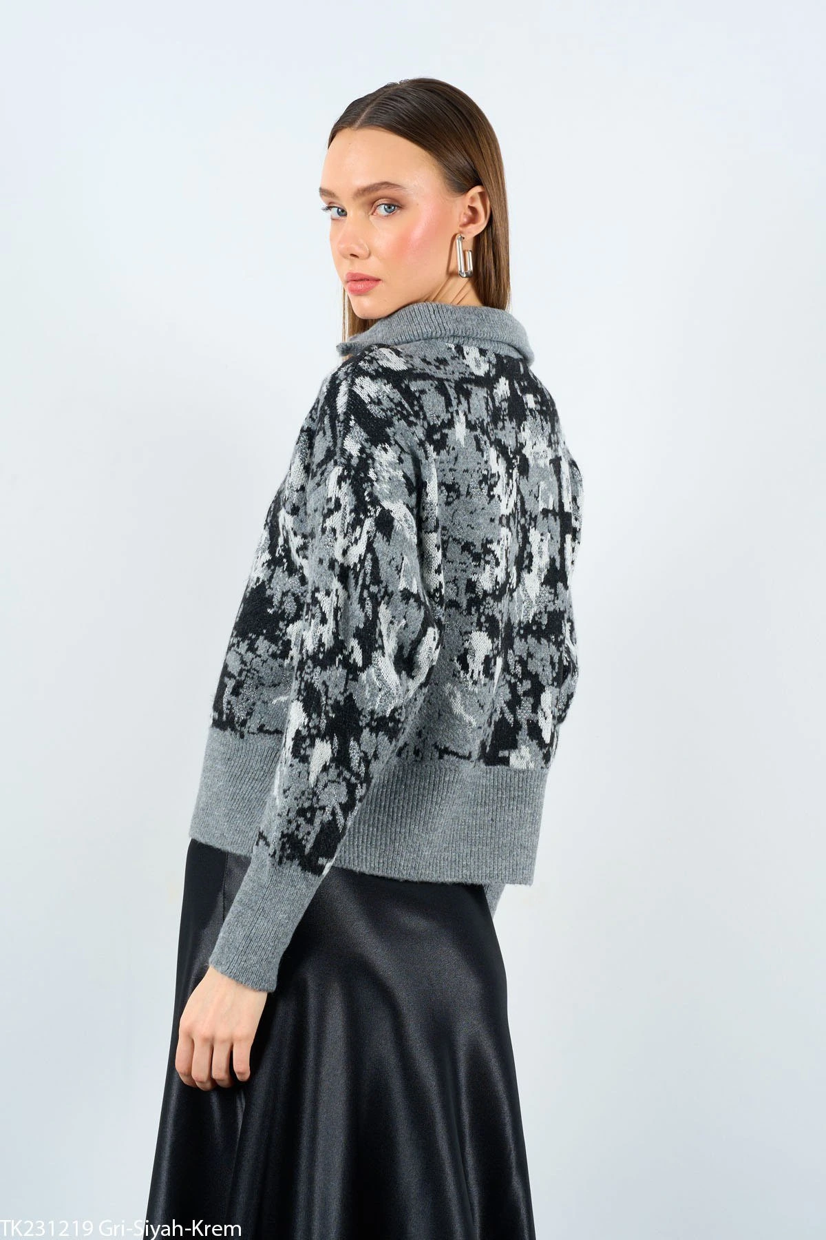 KAMYONER YAKA FERMUARLI SİM DOKUMA DESENLİ KAZAK – GRİ