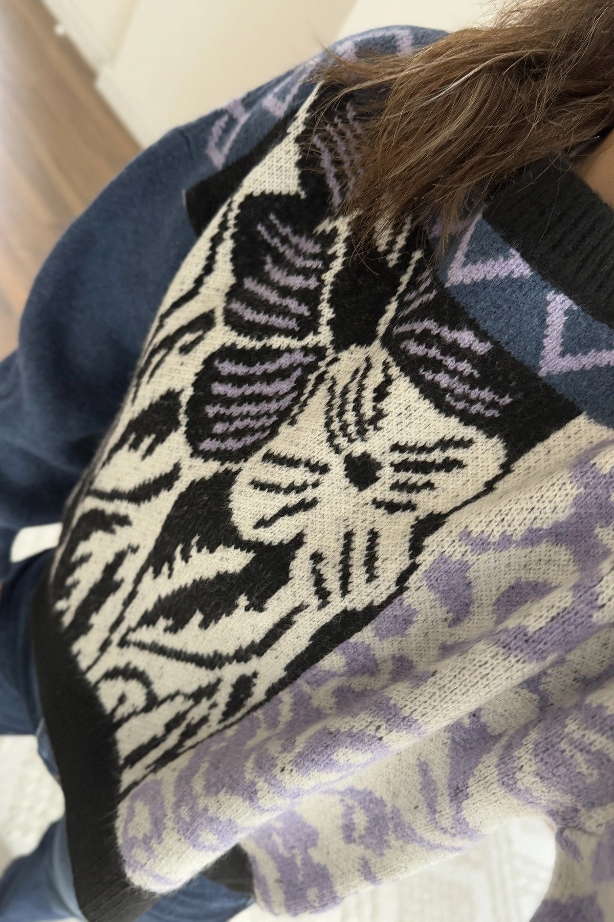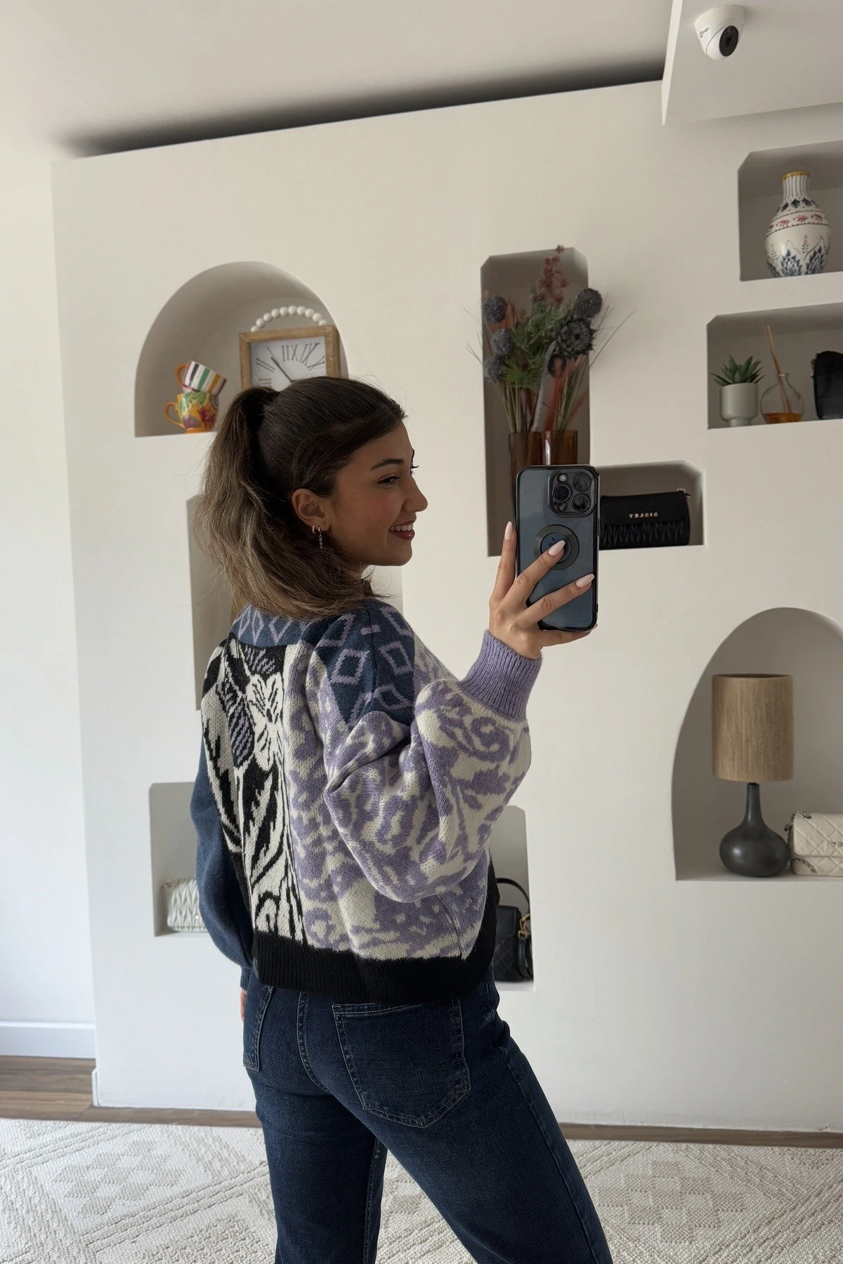 ÇİÇEK DESEN BİSİKLET YAKA KAZAK - LACİVERT EKRU