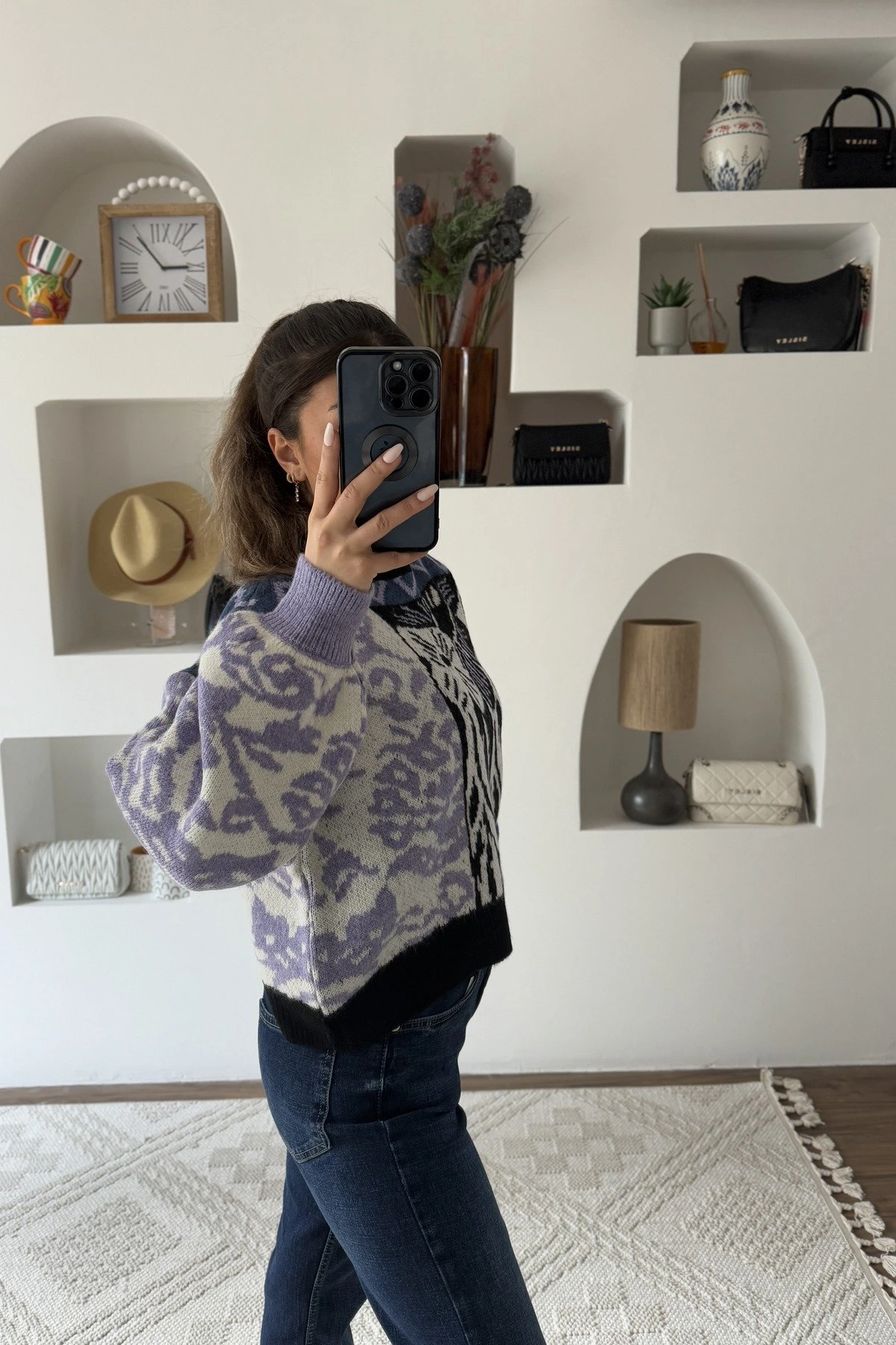 KARIŞIK DESEN VİSKON BİSİKLET YAKA KAZAK – SİYAH
