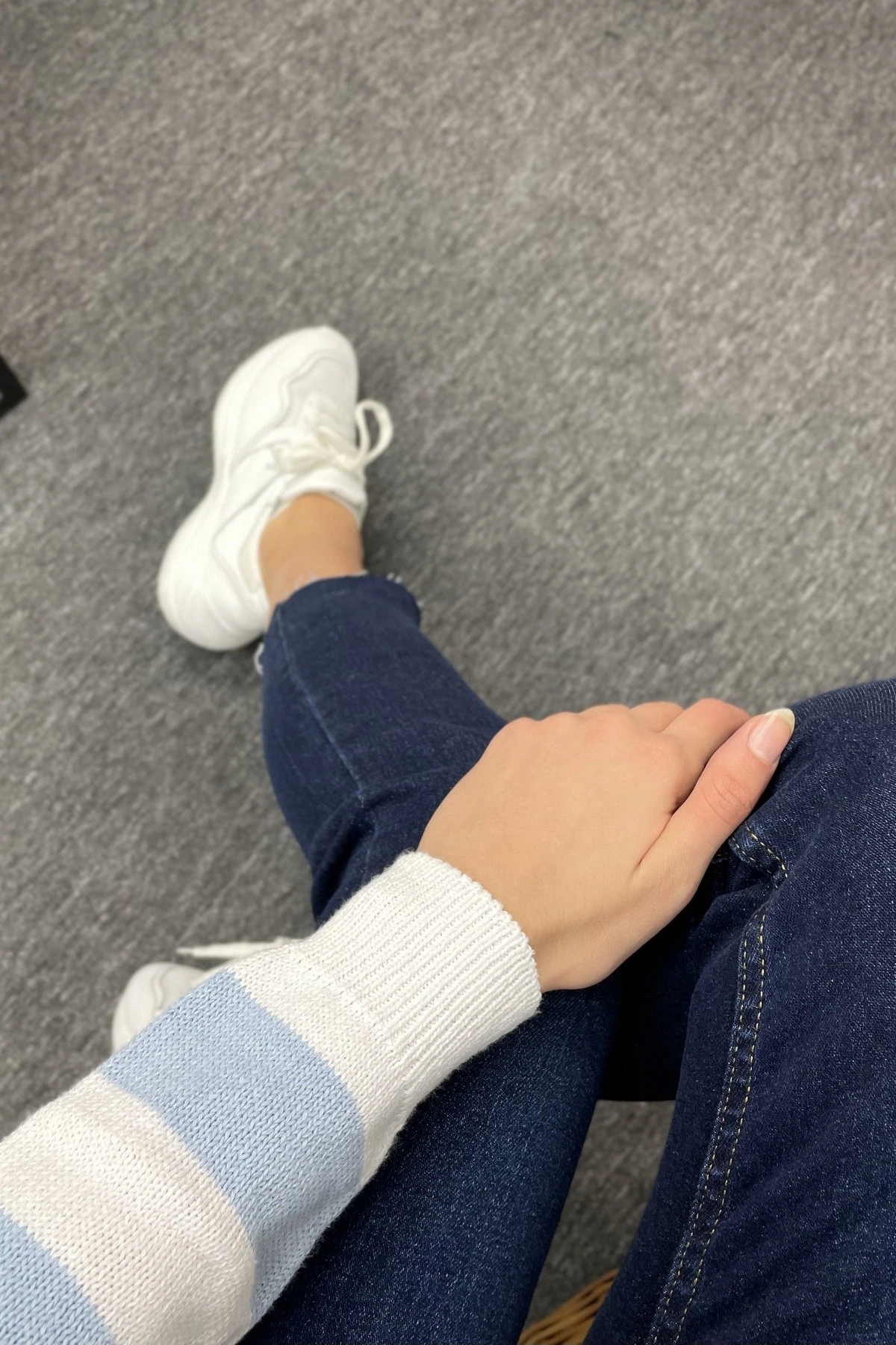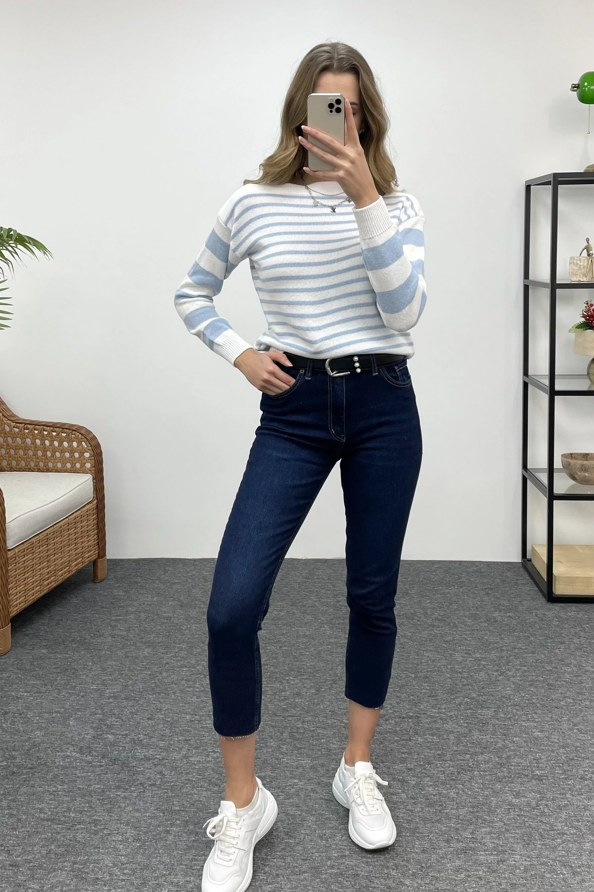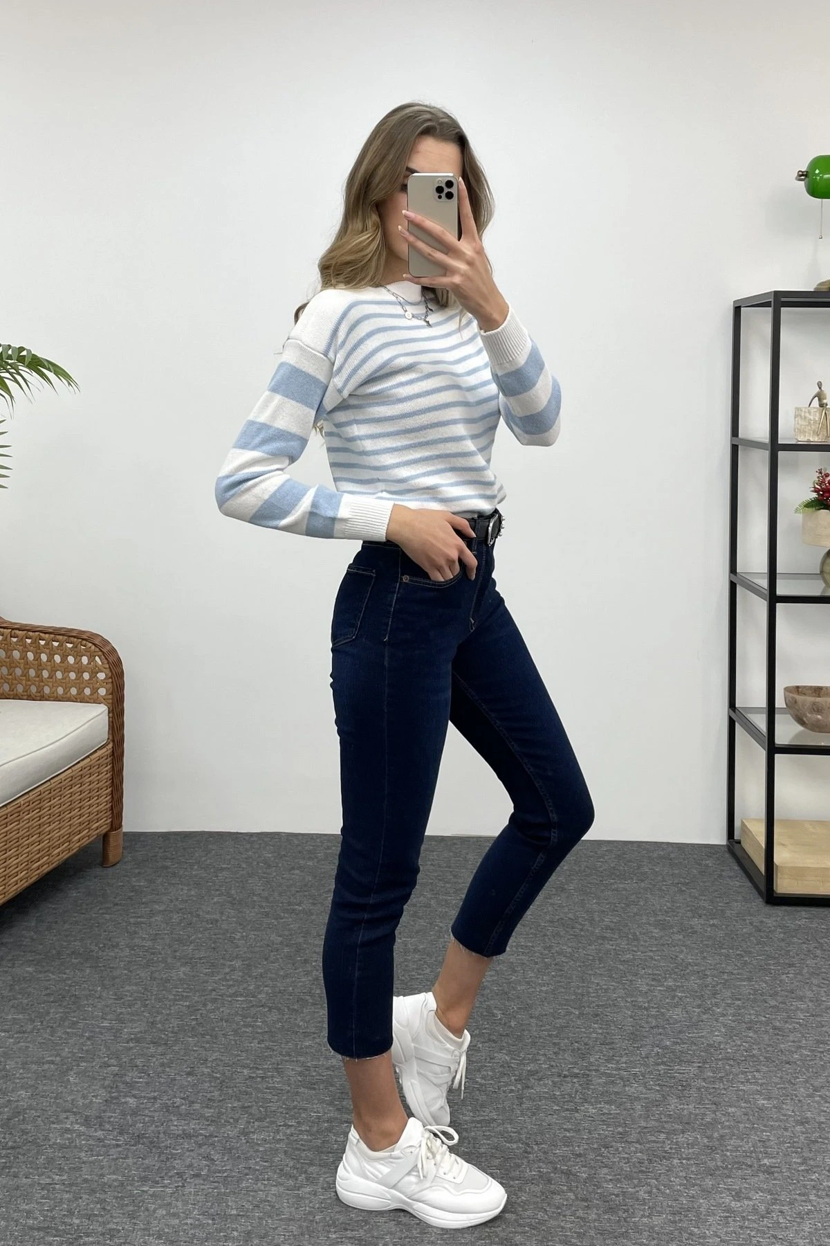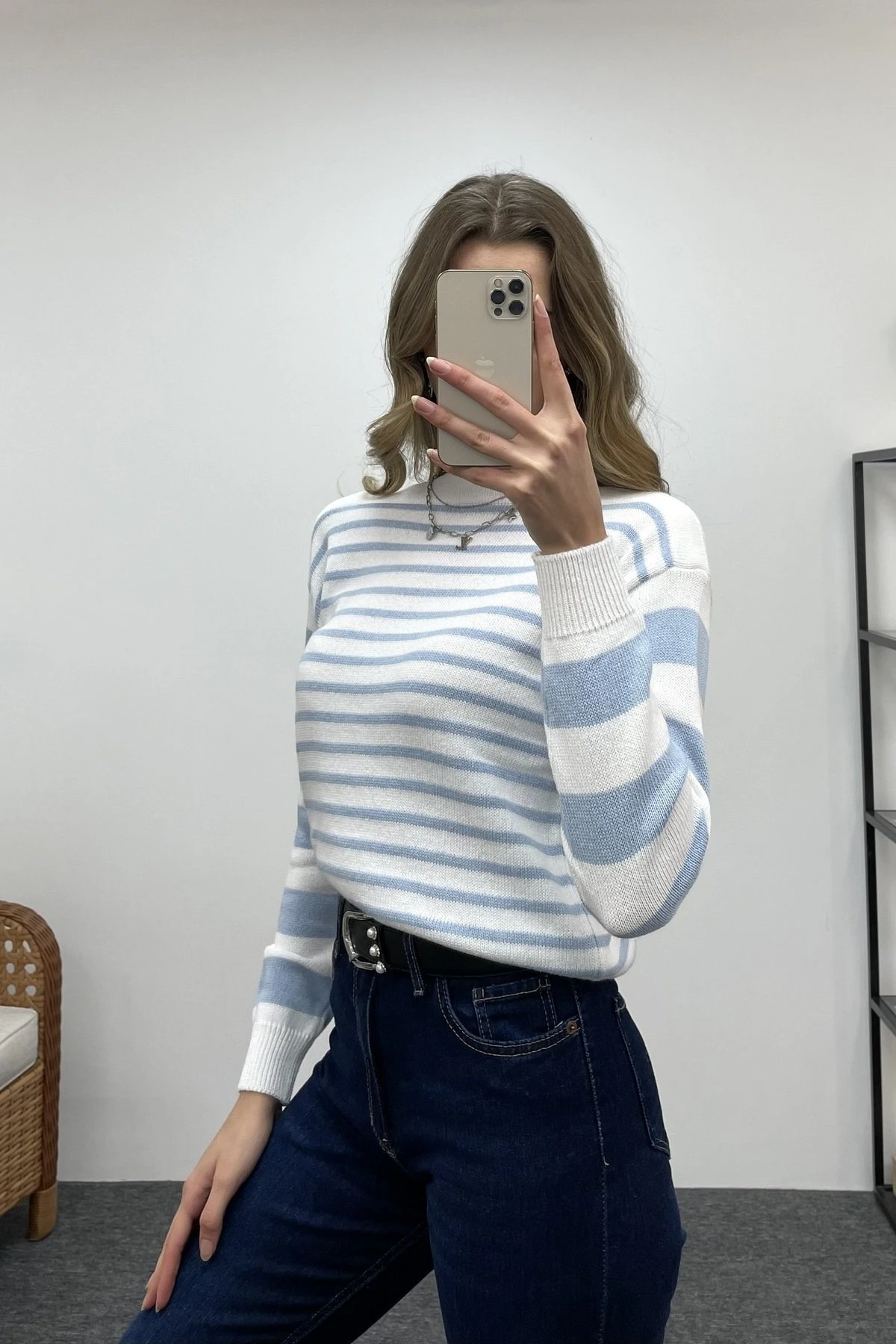 KAYIK YAKA ÇİZGİLİ KAZAK – MAVİ