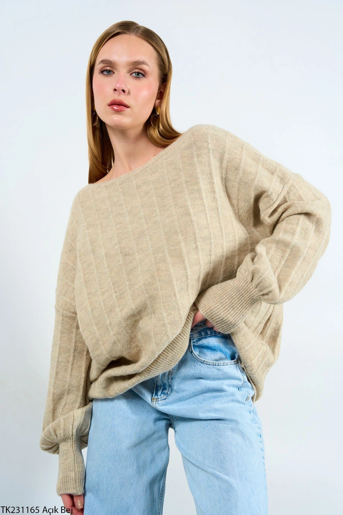 KAYIK YAKA DOKUMA DETAY SALAŞ KAZAK – AÇIK BEJ