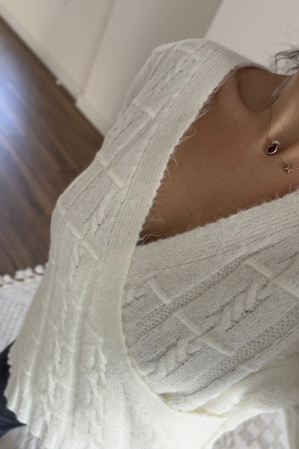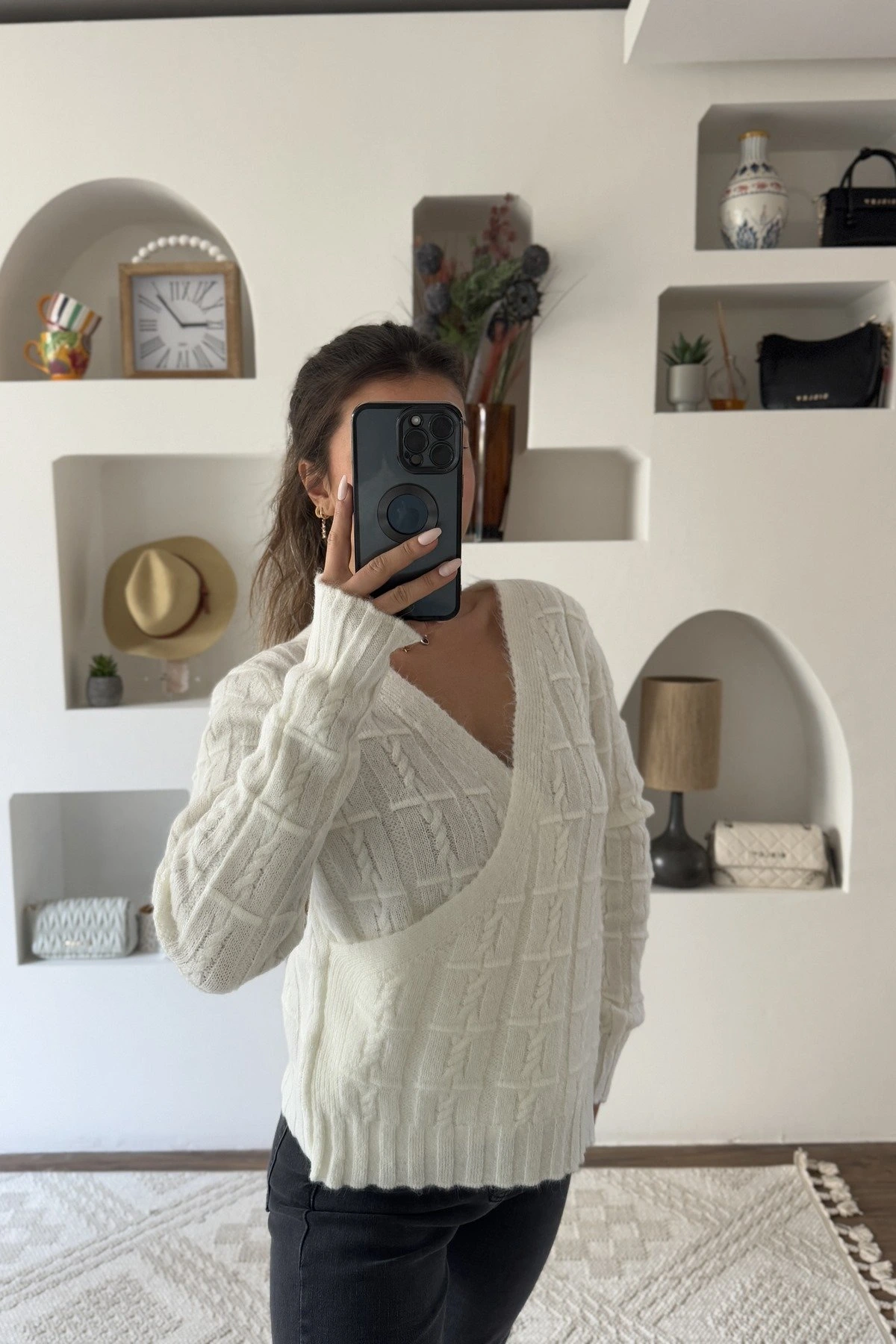 KRUVAZE V YAKA ETEĞİ ASİMETRİ KAZAK – EKRU