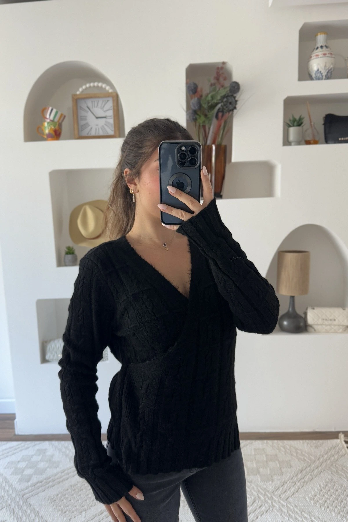 KRUVAZE V YAKA ETEĞİ ASİMETRİ KAZAK – SİYAH