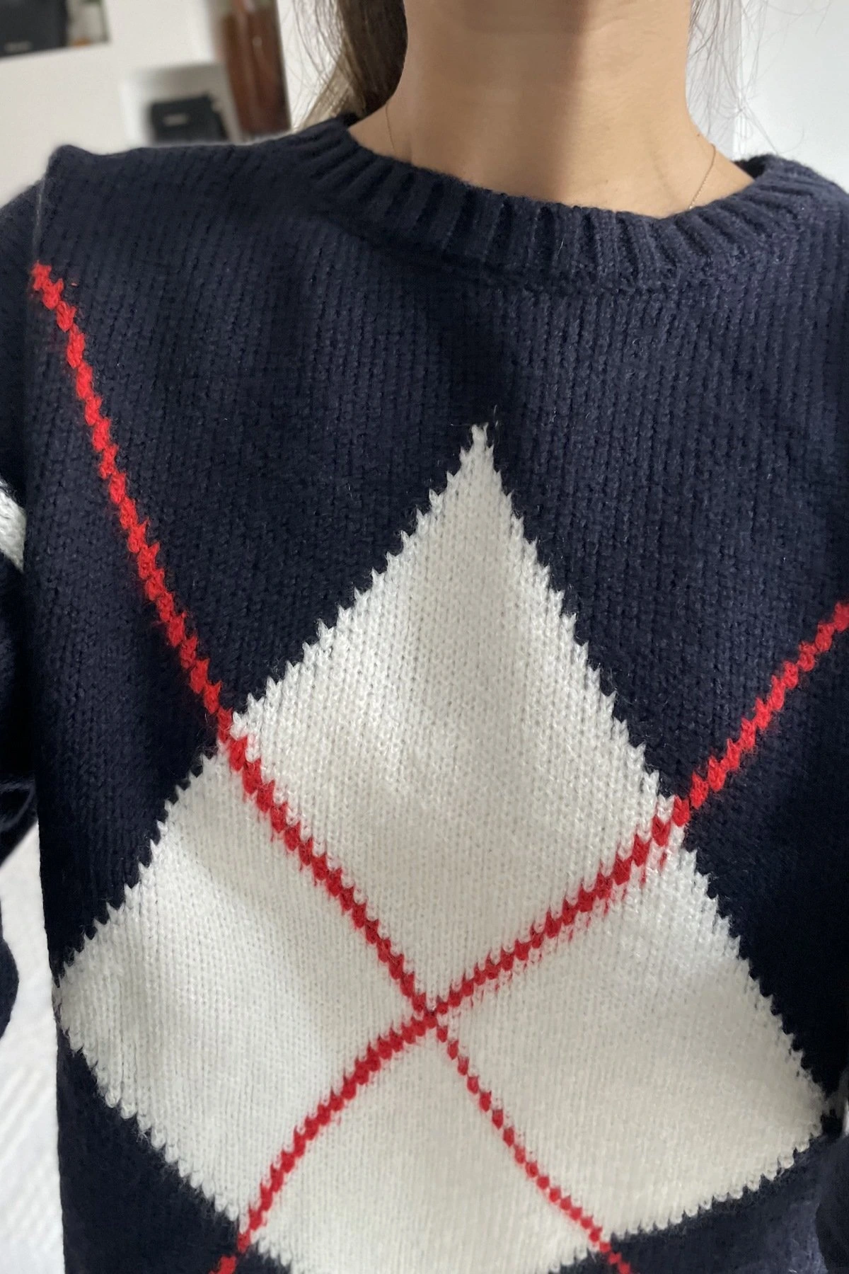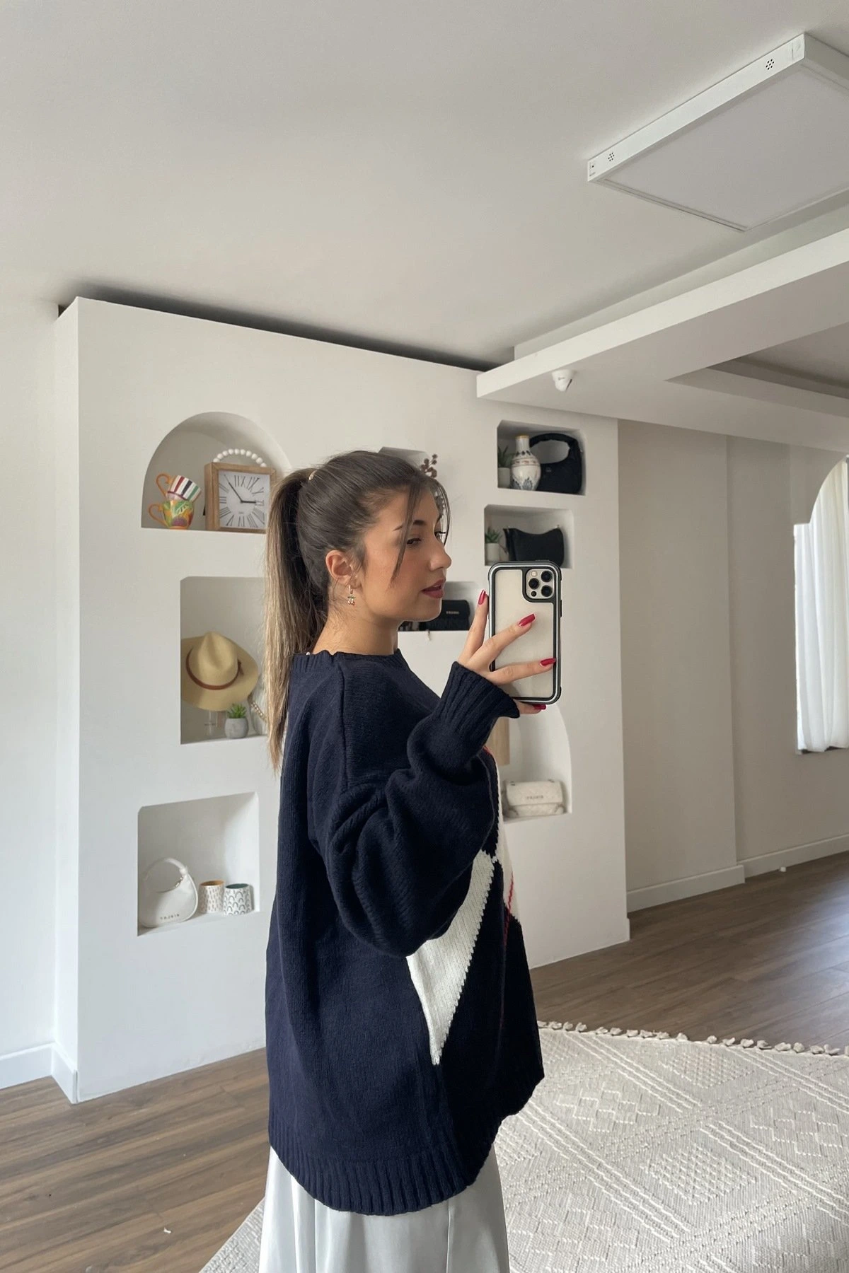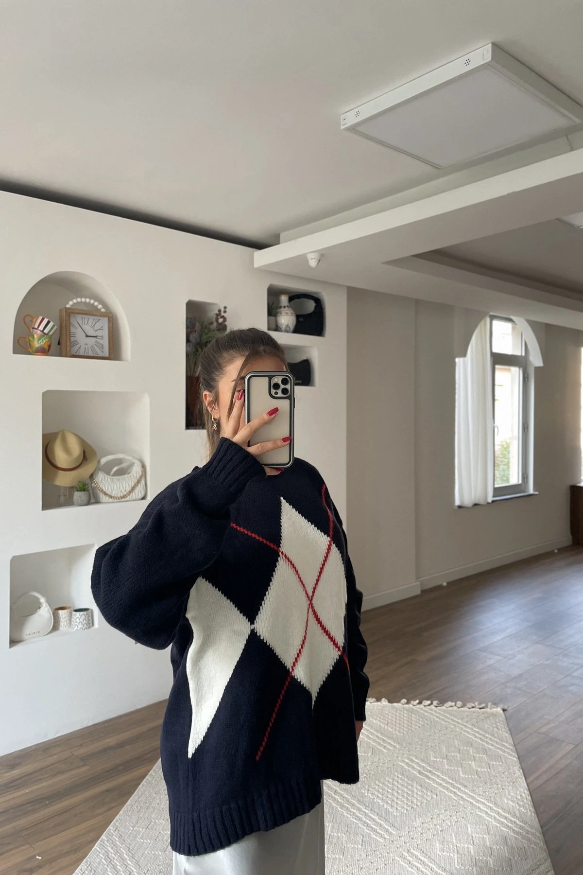 MNG BAKLAVA DESEN SALAŞ KAZAK – LACİVERT BEYAZ