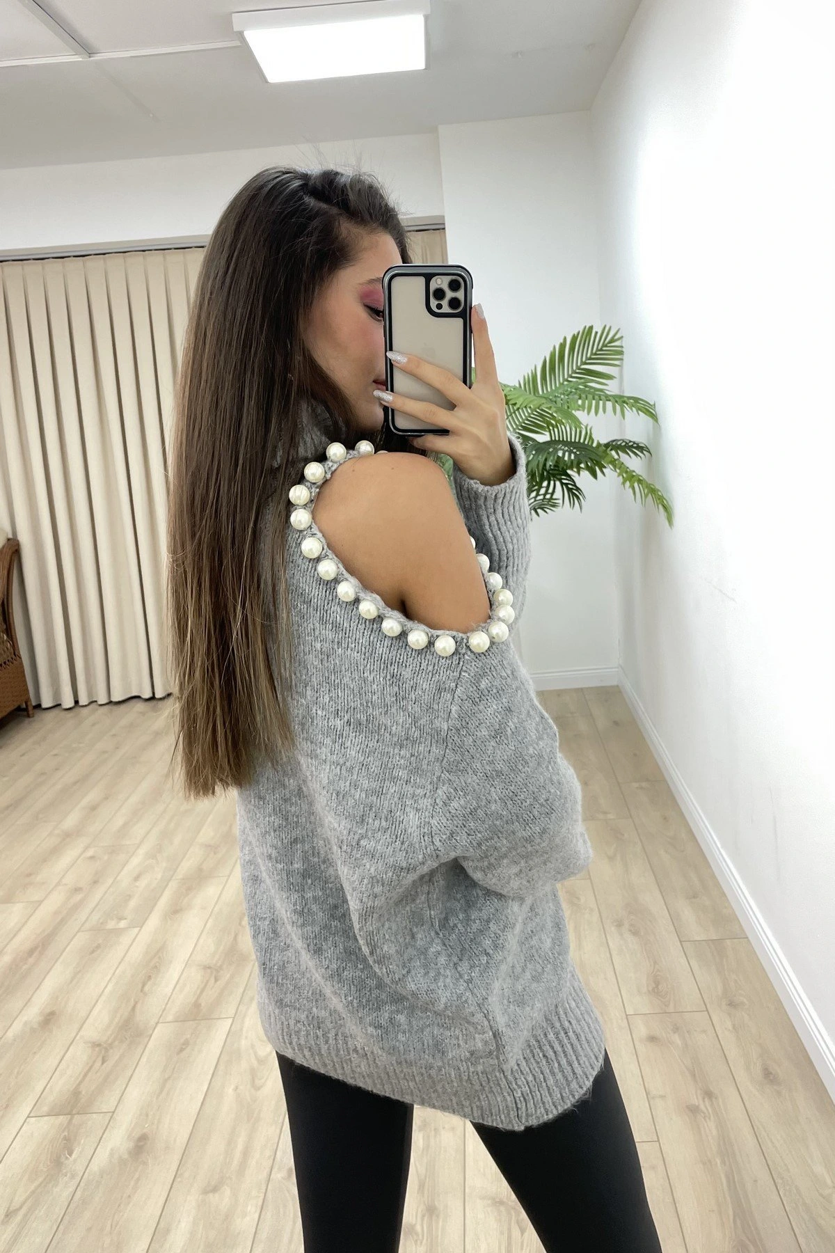 OMUZ DEKOLTE İNCİ DETAY BALIKÇI YAKA KAZAK – GRİ