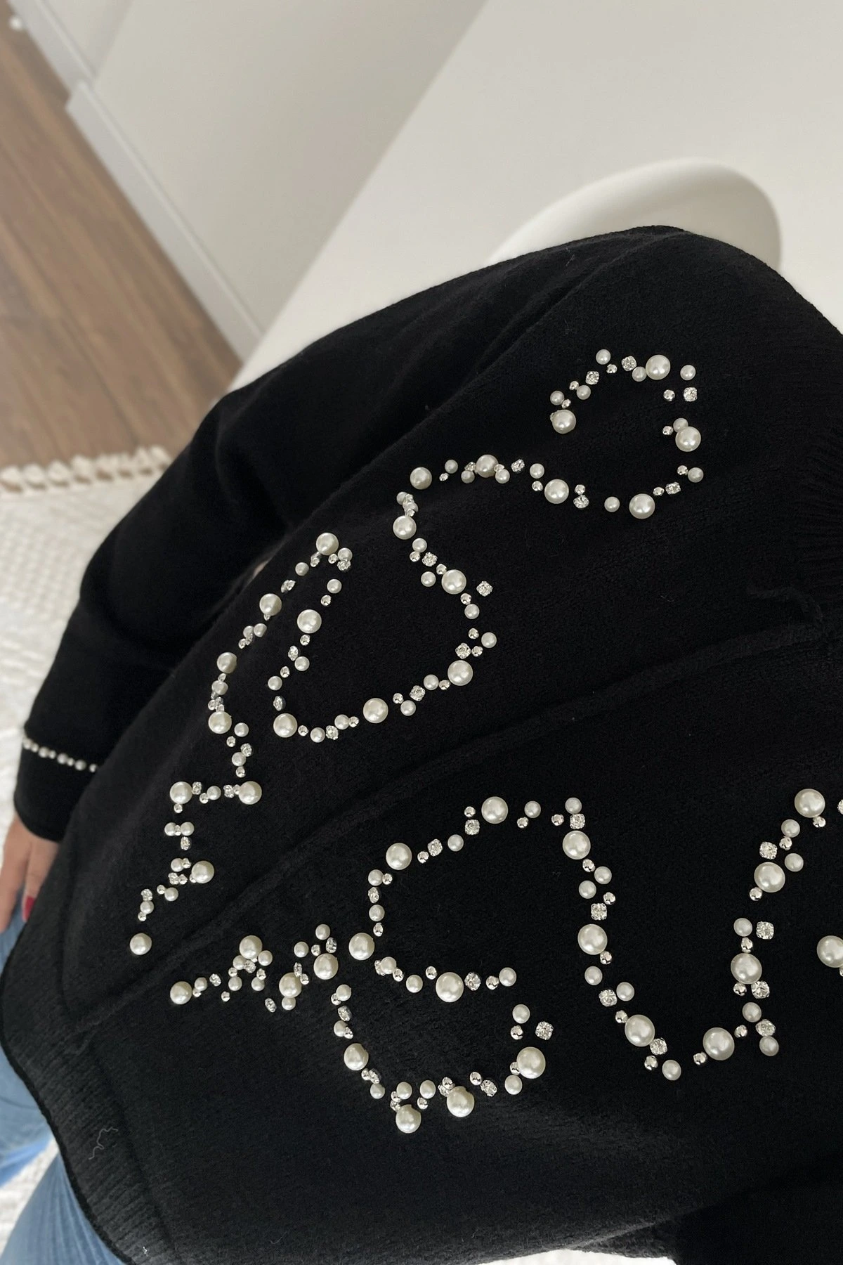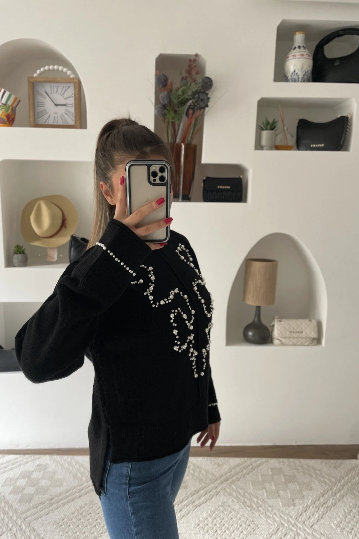 ÖN İNCİ TAŞ ÇAKIM YAN YIRTMAÇ BİSİKLET YAKA KAZAK – SİYAH