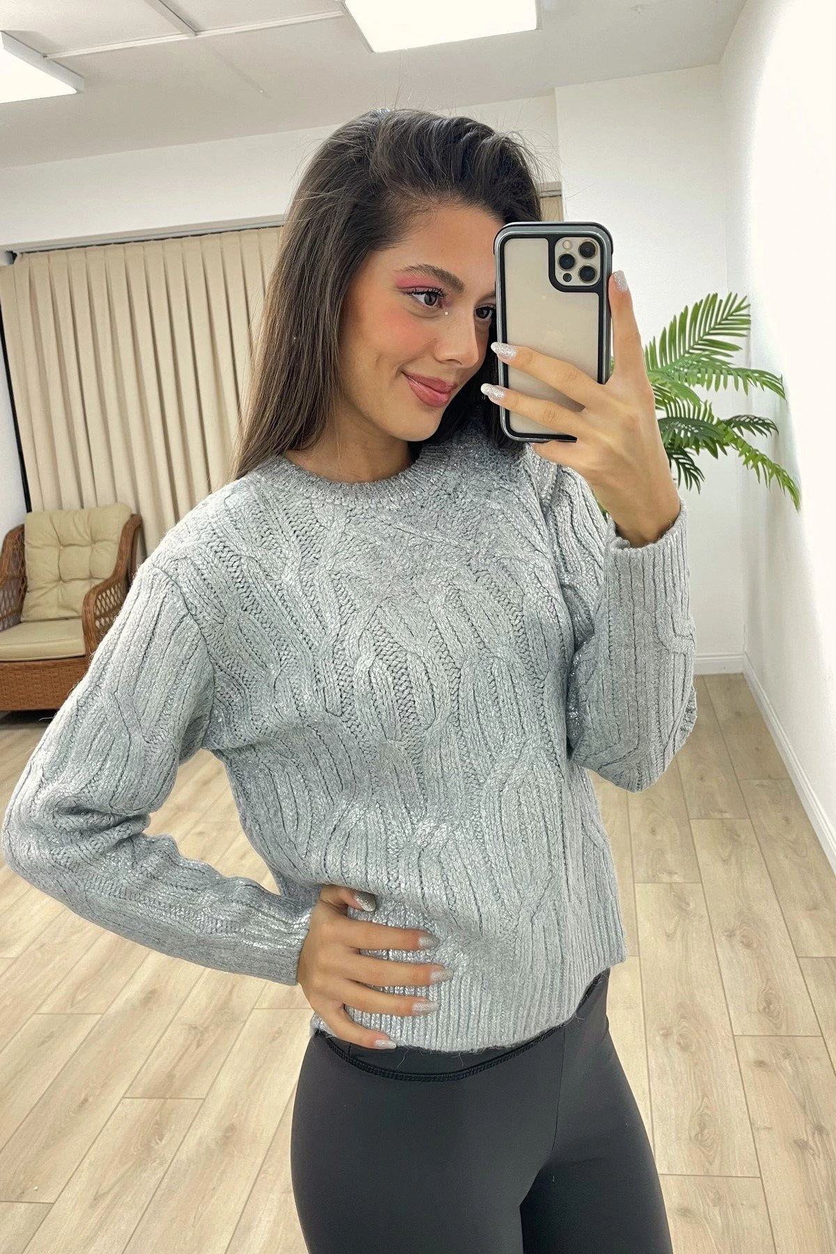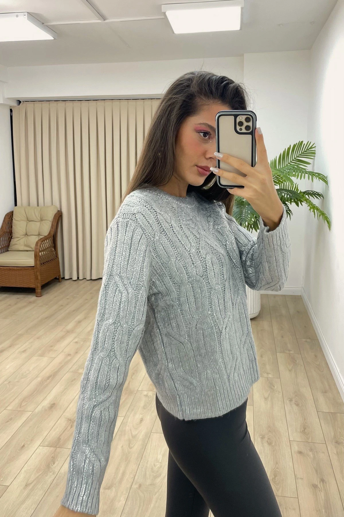 PARLAK BASKI BİSİKLET YAKA ÖRGÜ KAZAK – GRİ