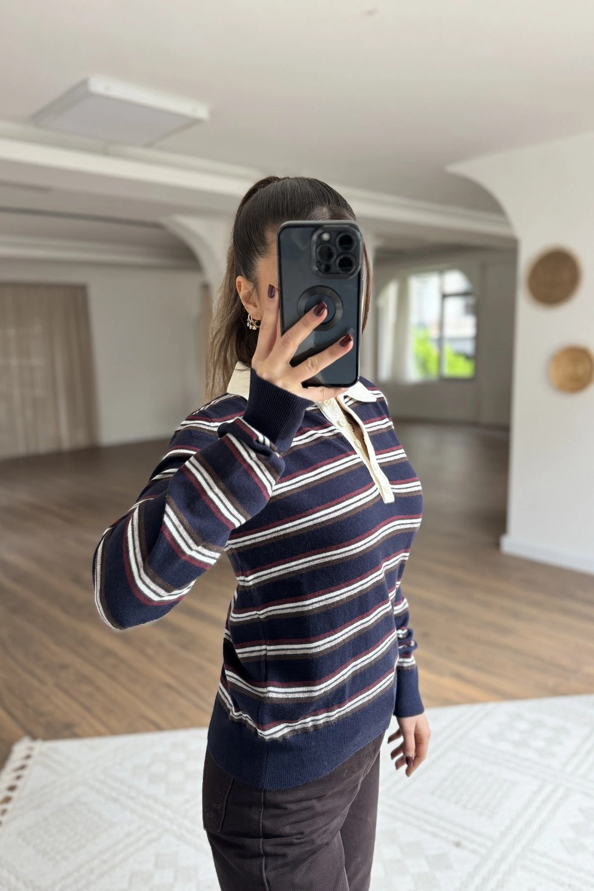 POLO YAKA YARI PATLI YÜN KARIŞIM ÇİZGİLİ KAZAK – LACİVERT