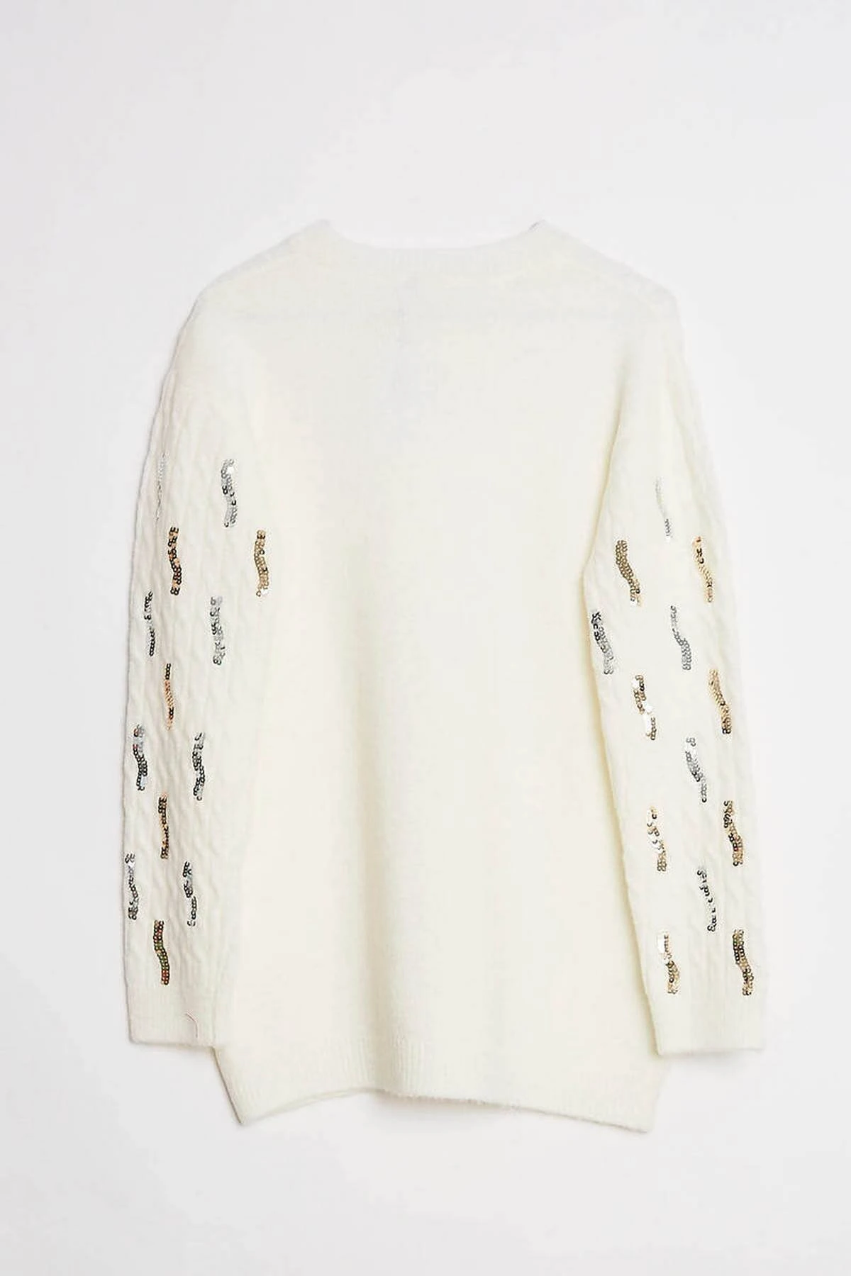 PULPAYET İŞLEME SAÇ ÖRGÜ UZUN KAZAK – EKRU