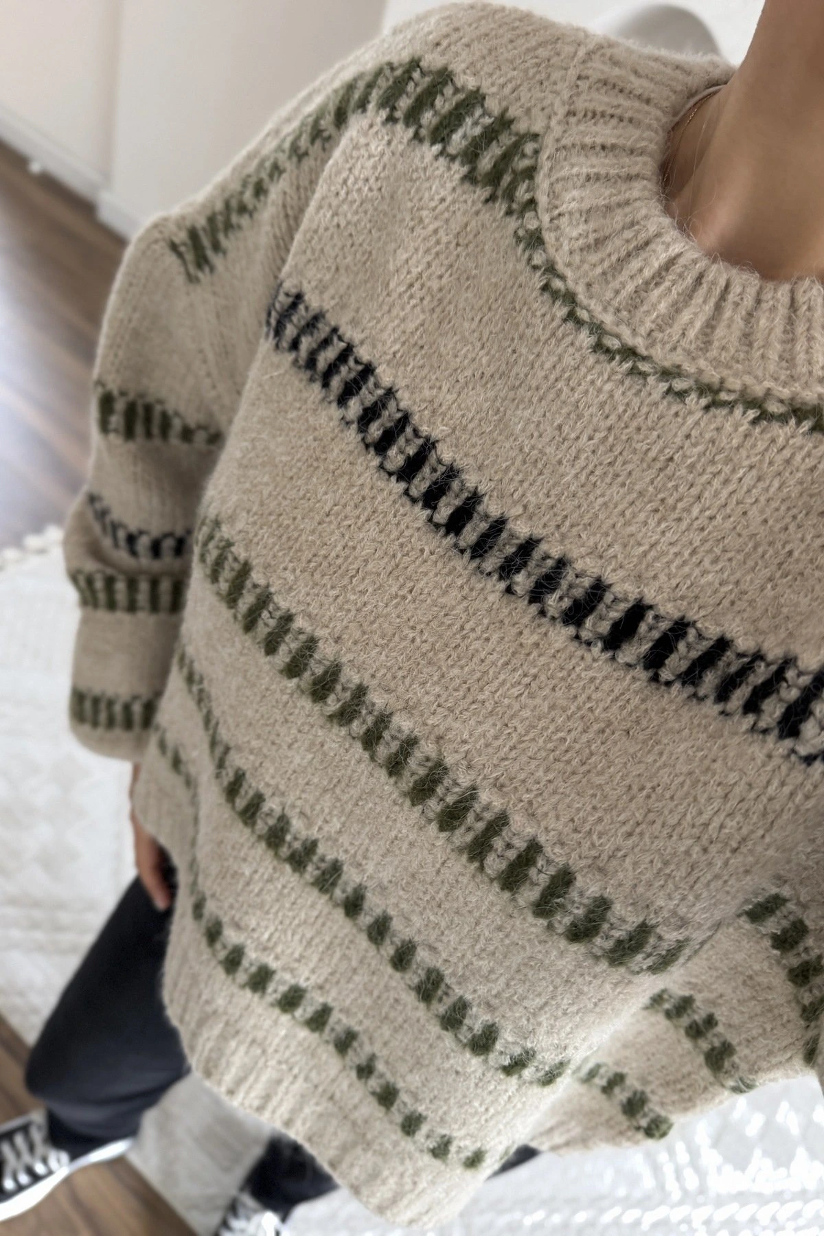 RENKLİ ÇİZGİ DOKUMA BİSİKLET YAKA KISA KAZAK – TAŞ