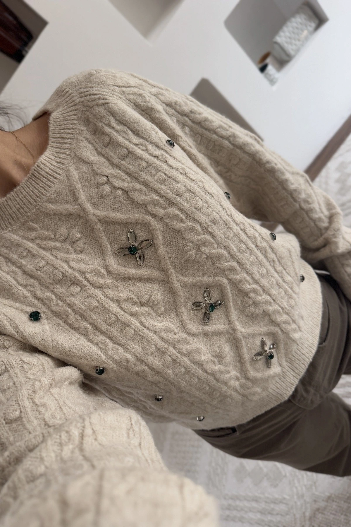 RENKLİ TAŞ DİKİM BİSİKLET YAKA KAZAK – BEJ