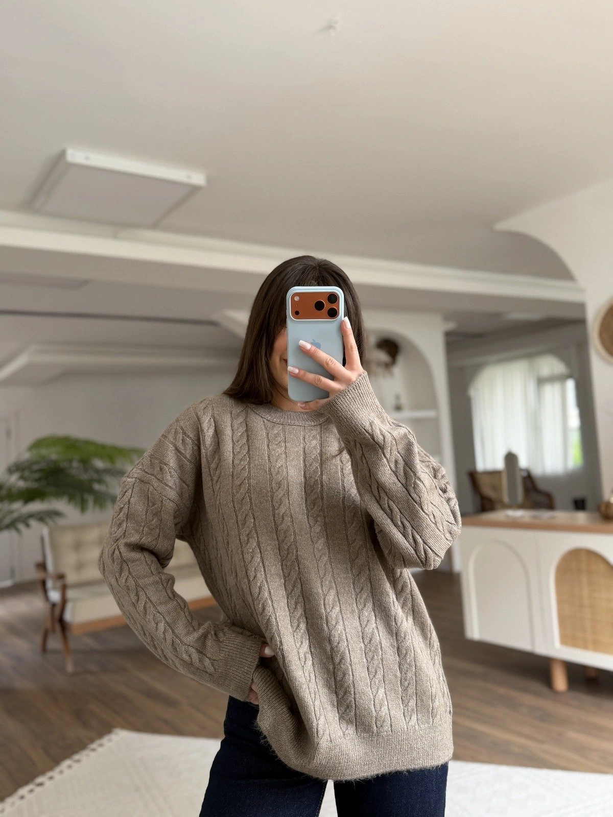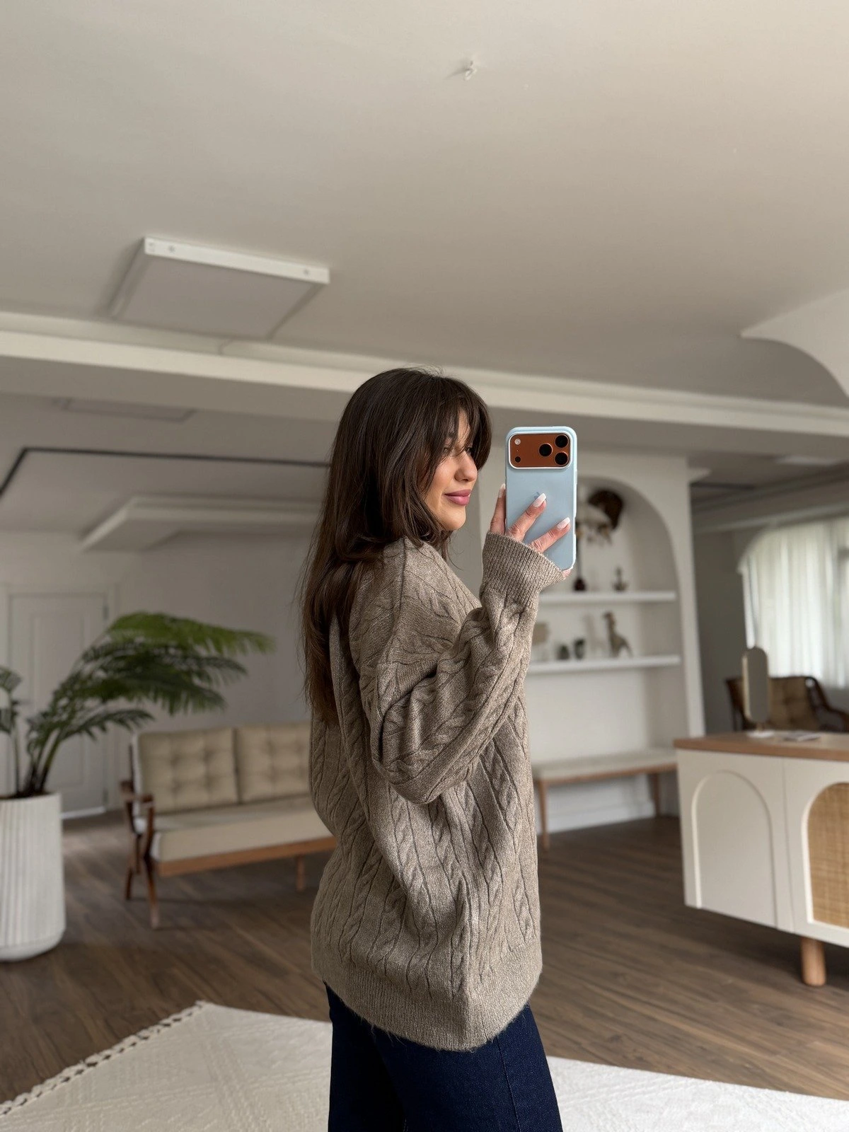SAÇ ÖRGÜ BİSİKLET YAKA SALAŞ KAZAK – VİZON