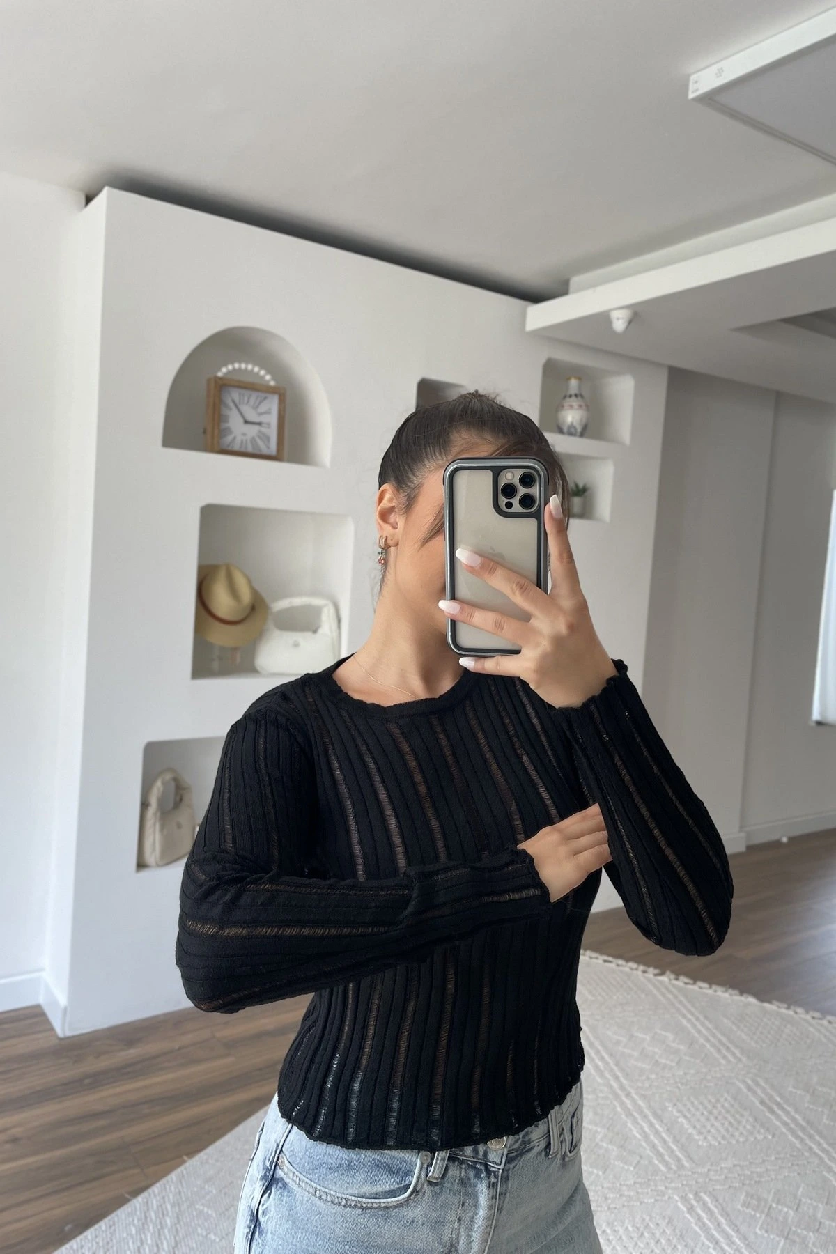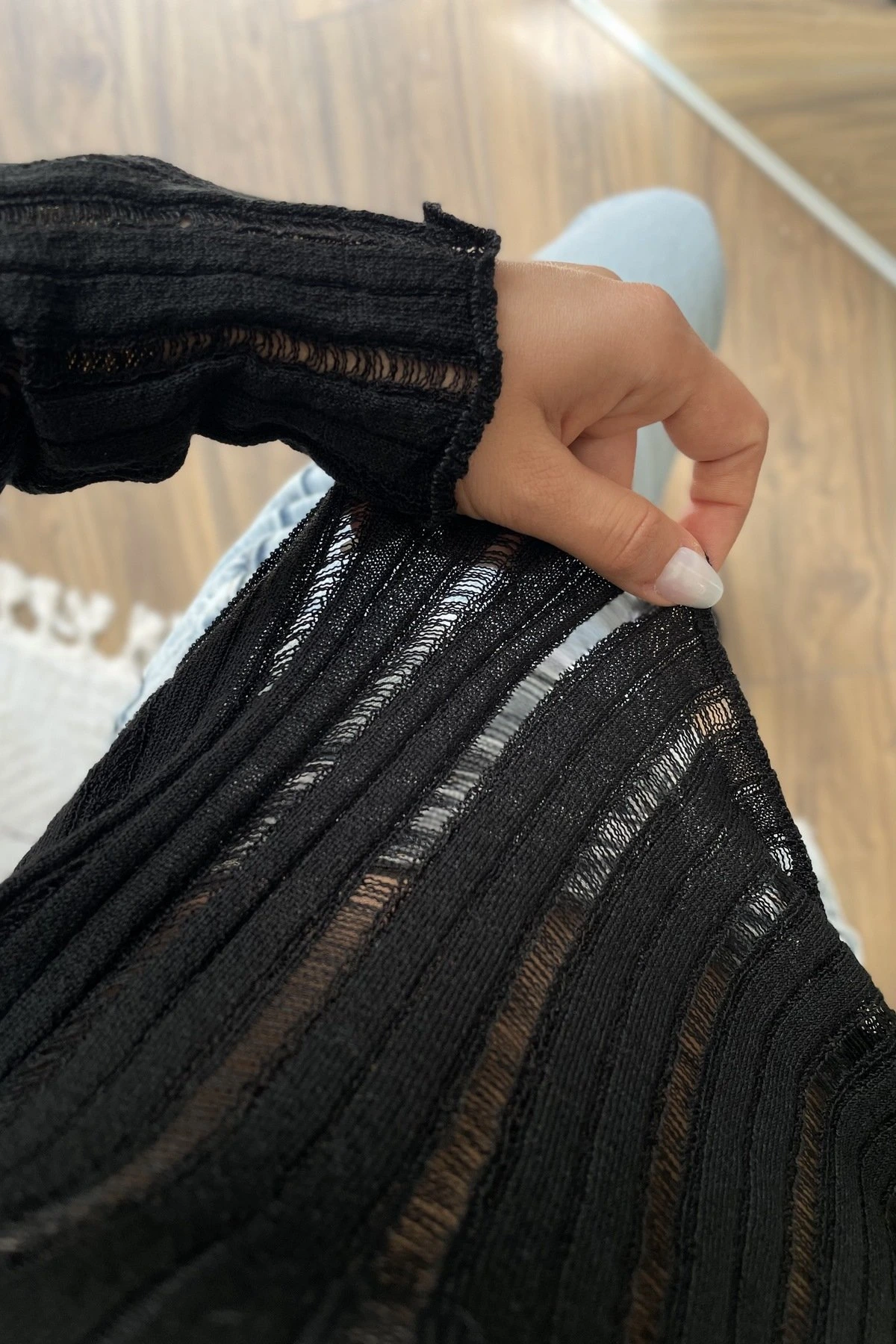 ŞERİT AJURLU BİSİKLET YAKA KAZAK – SİYAH