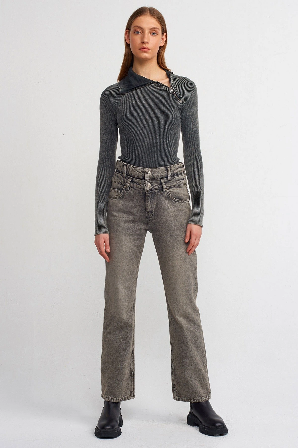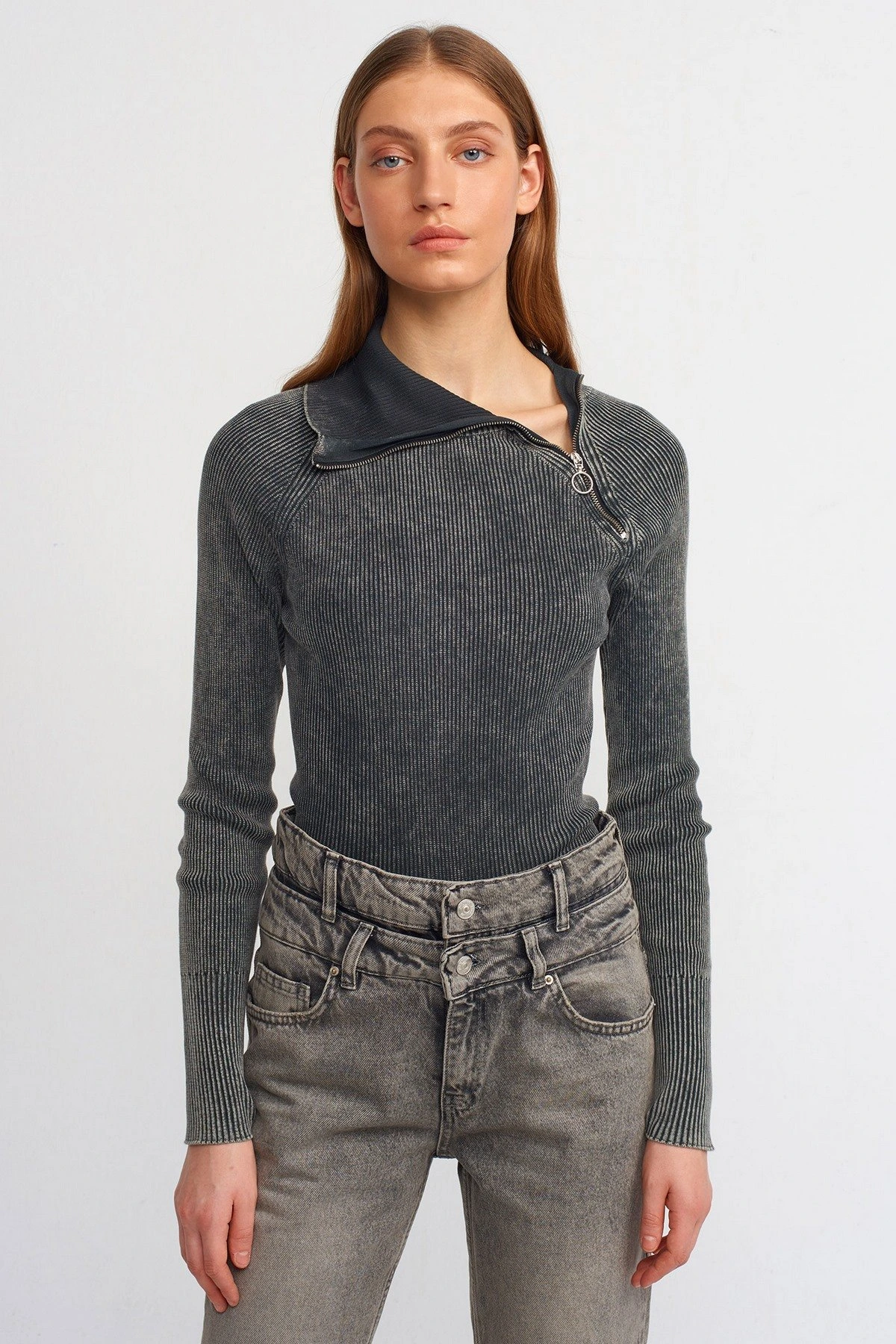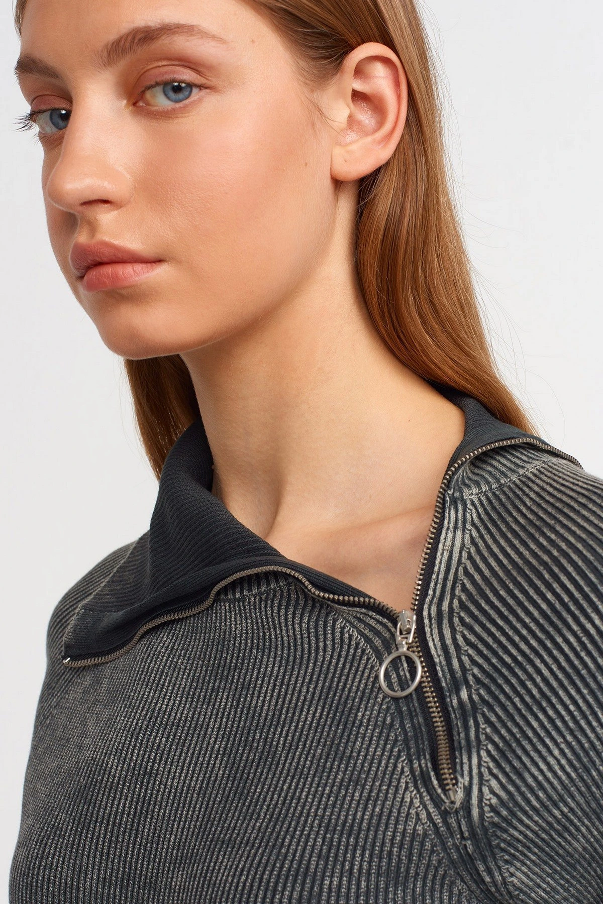SOLUK EFEKLİ YAKA YAN FERMUAR PAMUK KAZAK – ANTRASİT