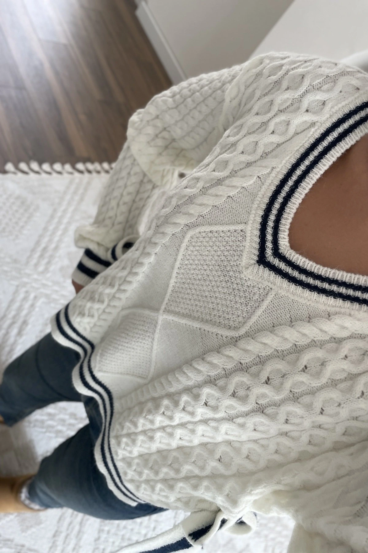 V YAKA ÇİZGİ ŞERİT YAN BAĞLAMALI KAZAK – EKRU
