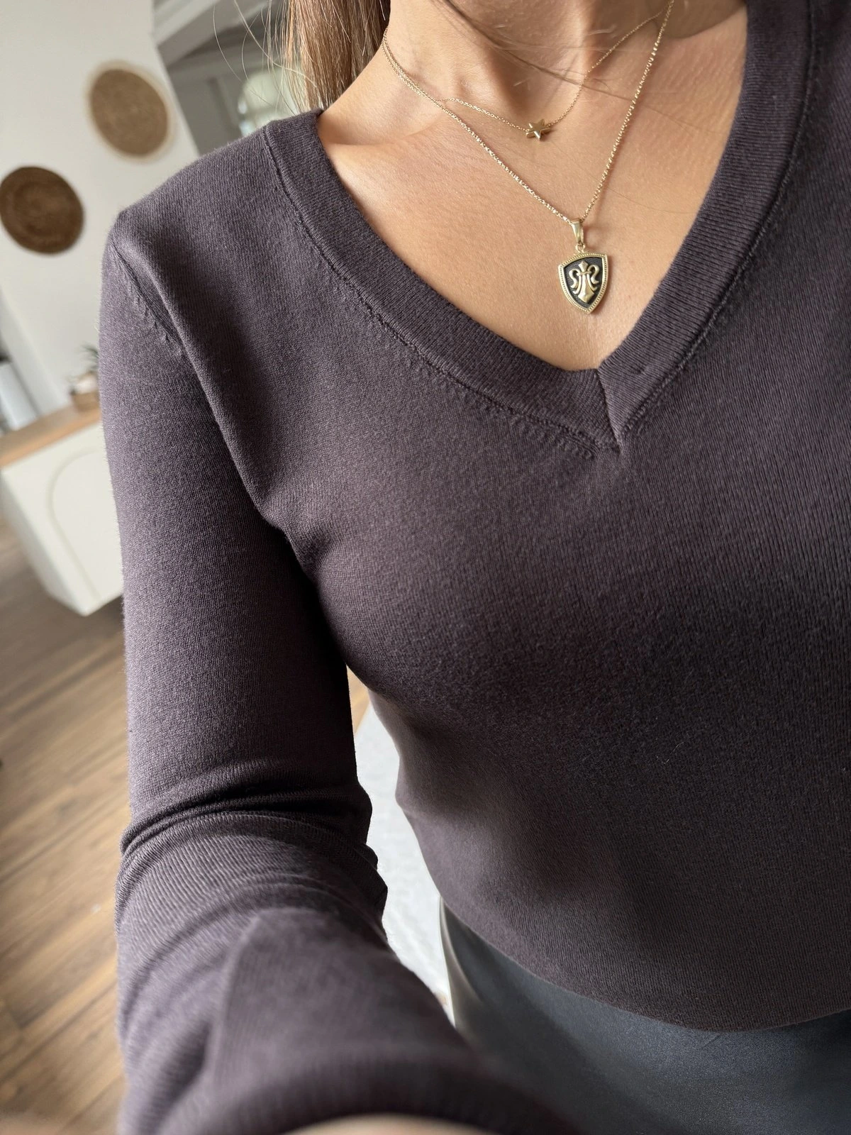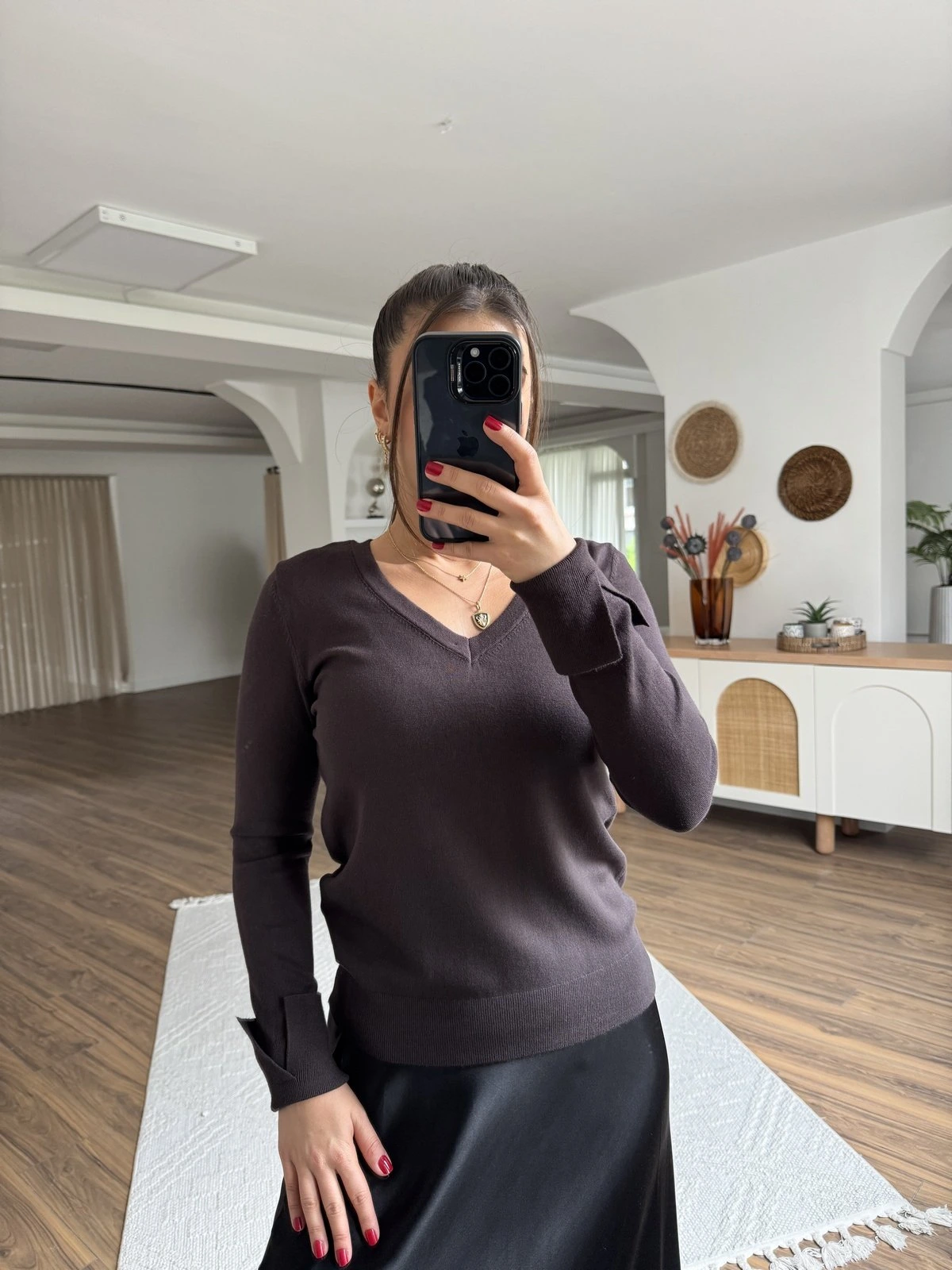 V YAKA KOL YIRTMAÇ VİSKON KAZAK – KOYU KAHVE