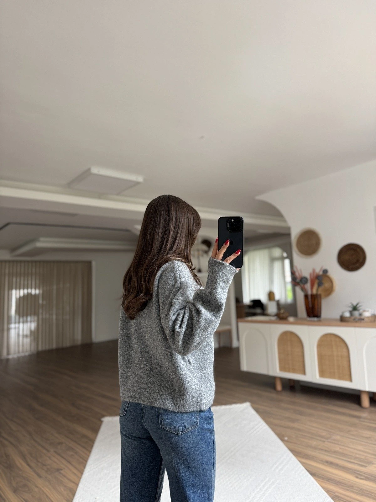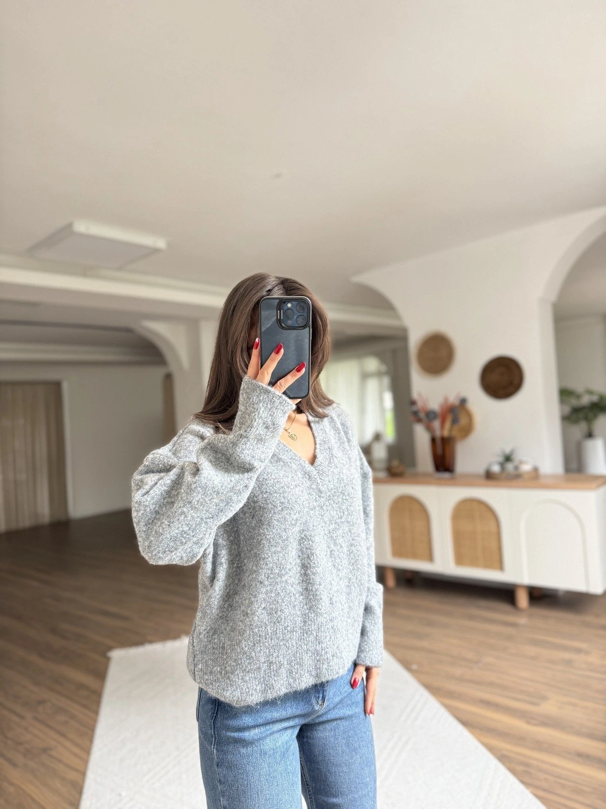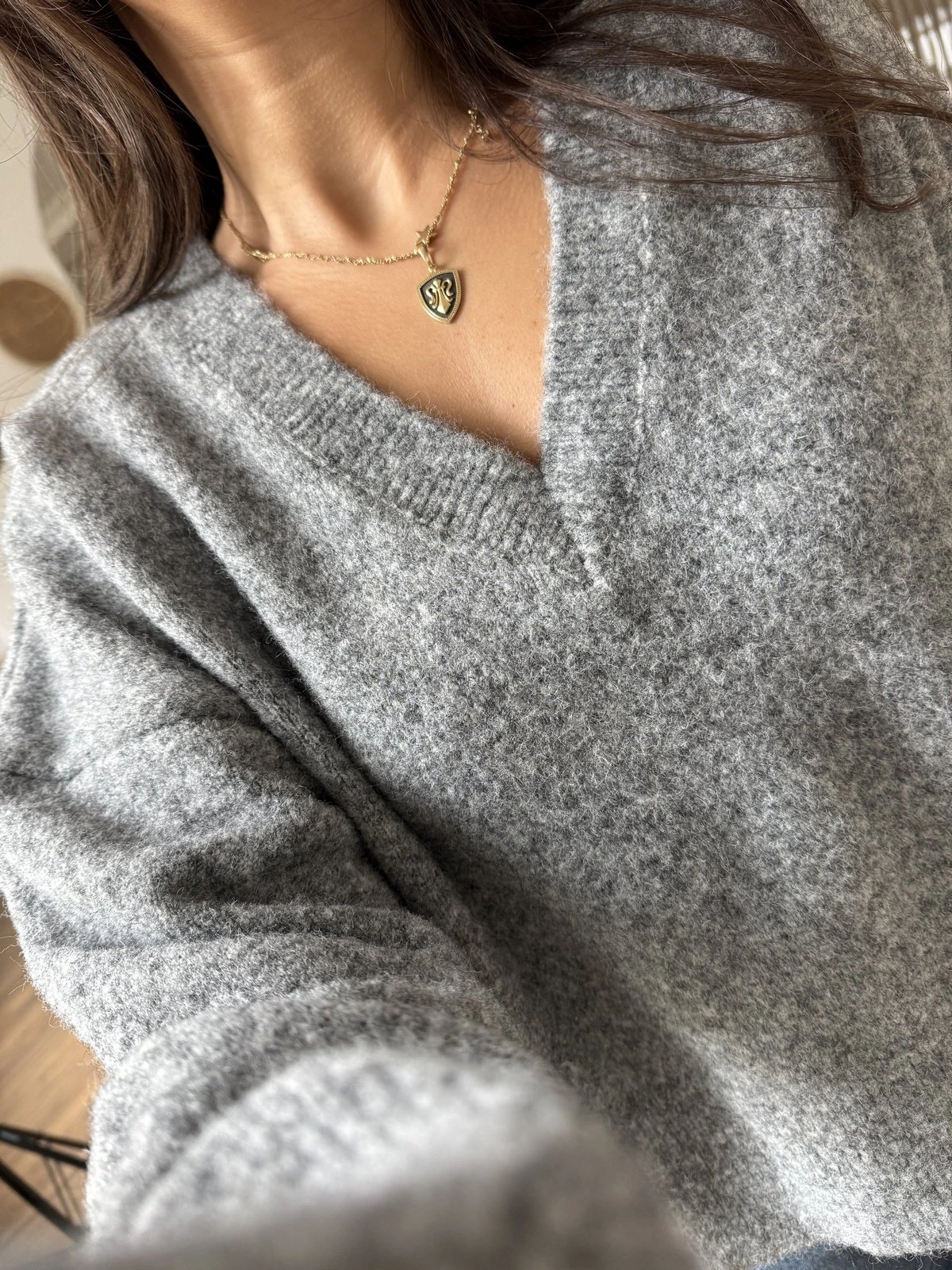 V YAKA YUMUŞAK DOKU YÜN KARIŞIMLI DÜŞÜK OMUZ KAZAK – FÜME MELANJ