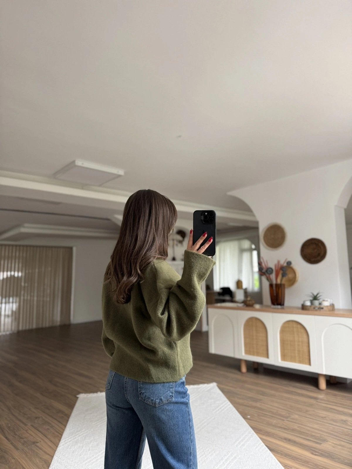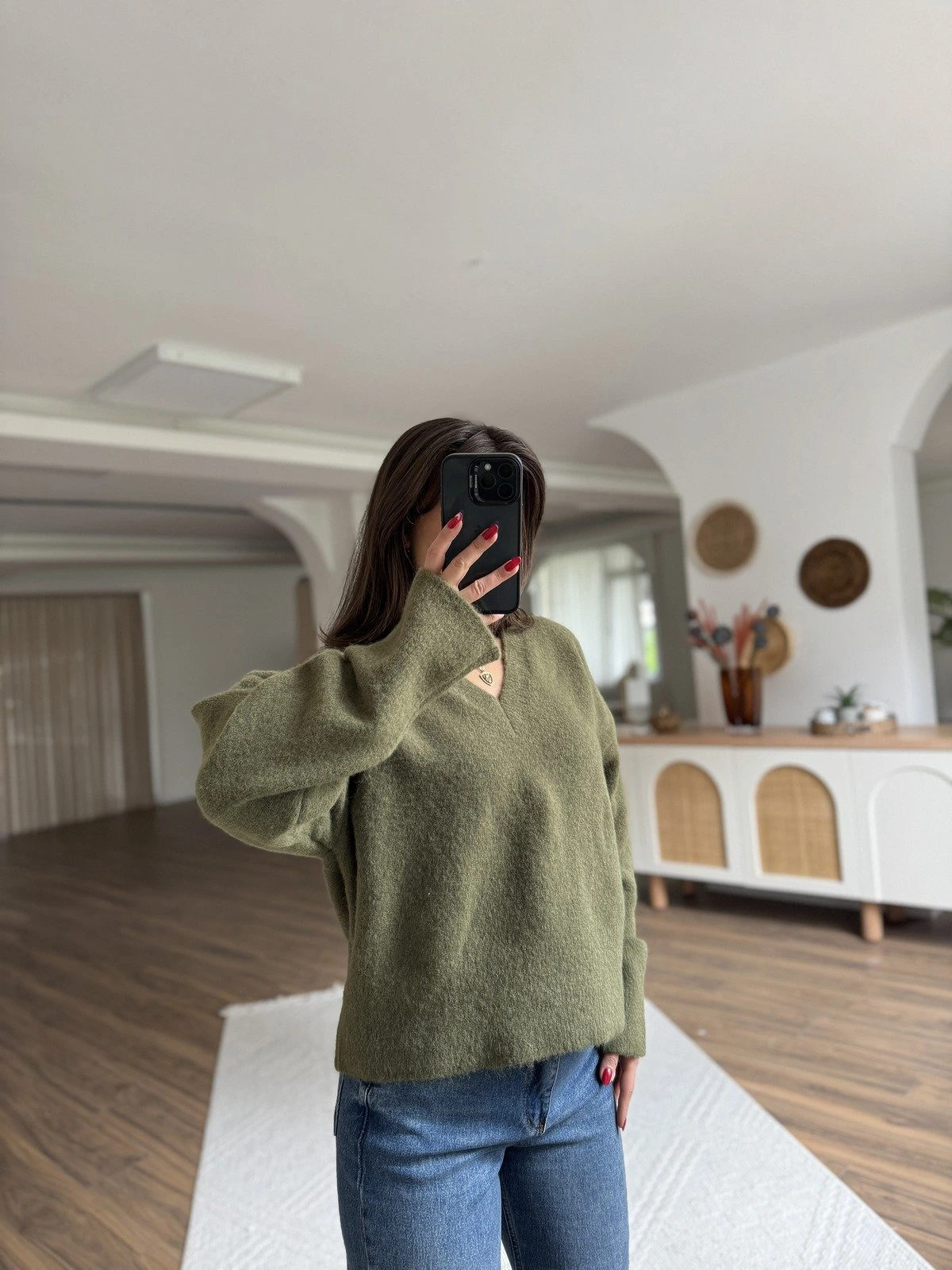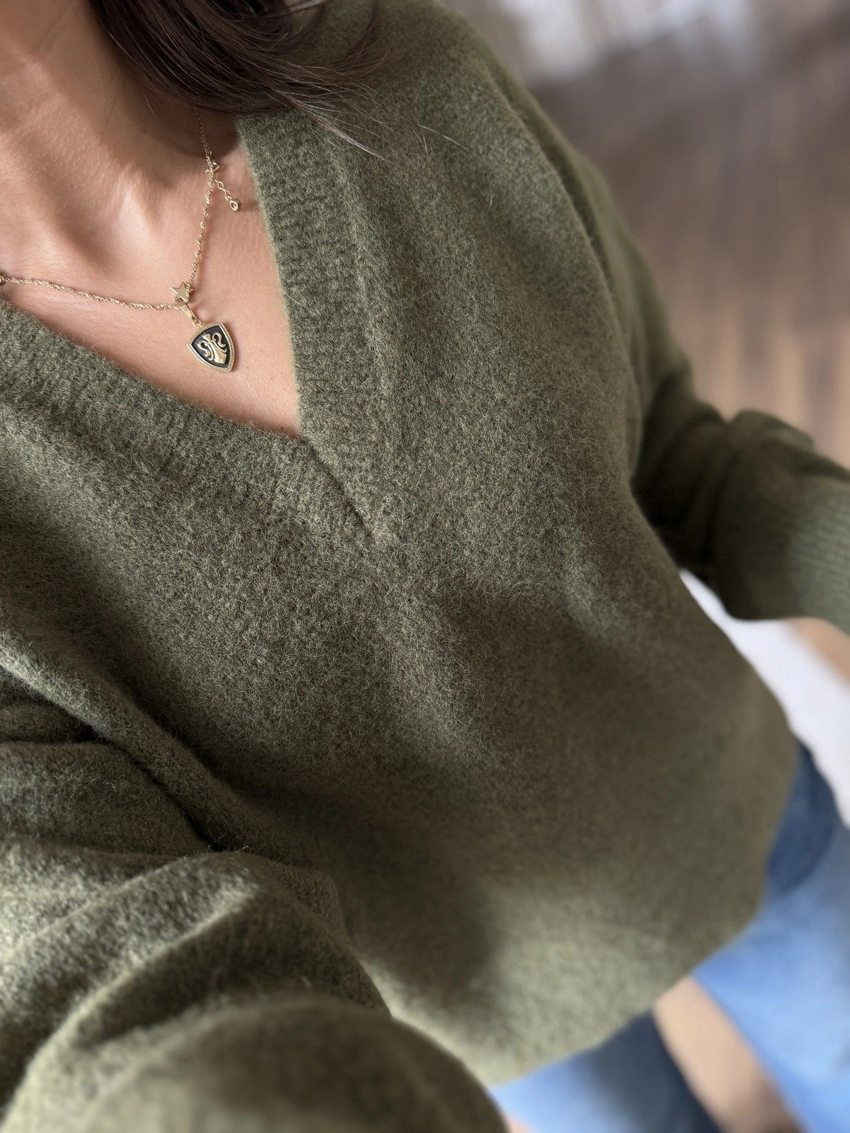 V YAKA YUMUŞAK DOKU YÜN KARIŞIMLI DÜŞÜK OMUZ KAZAK – HAKİ