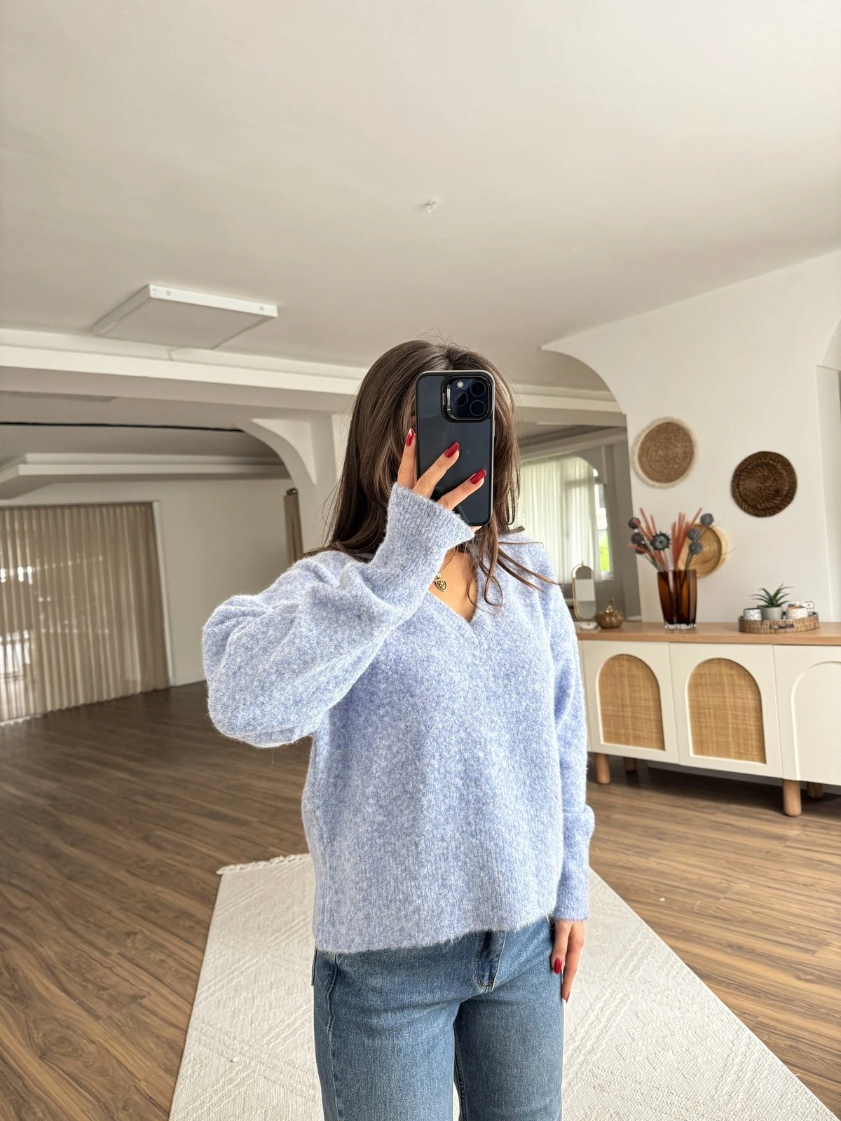 V YAKA YUMUŞAK DOKU YÜN KARIŞIMLI DÜŞÜK OMUZ KAZAK – İNDİGO MELANJ