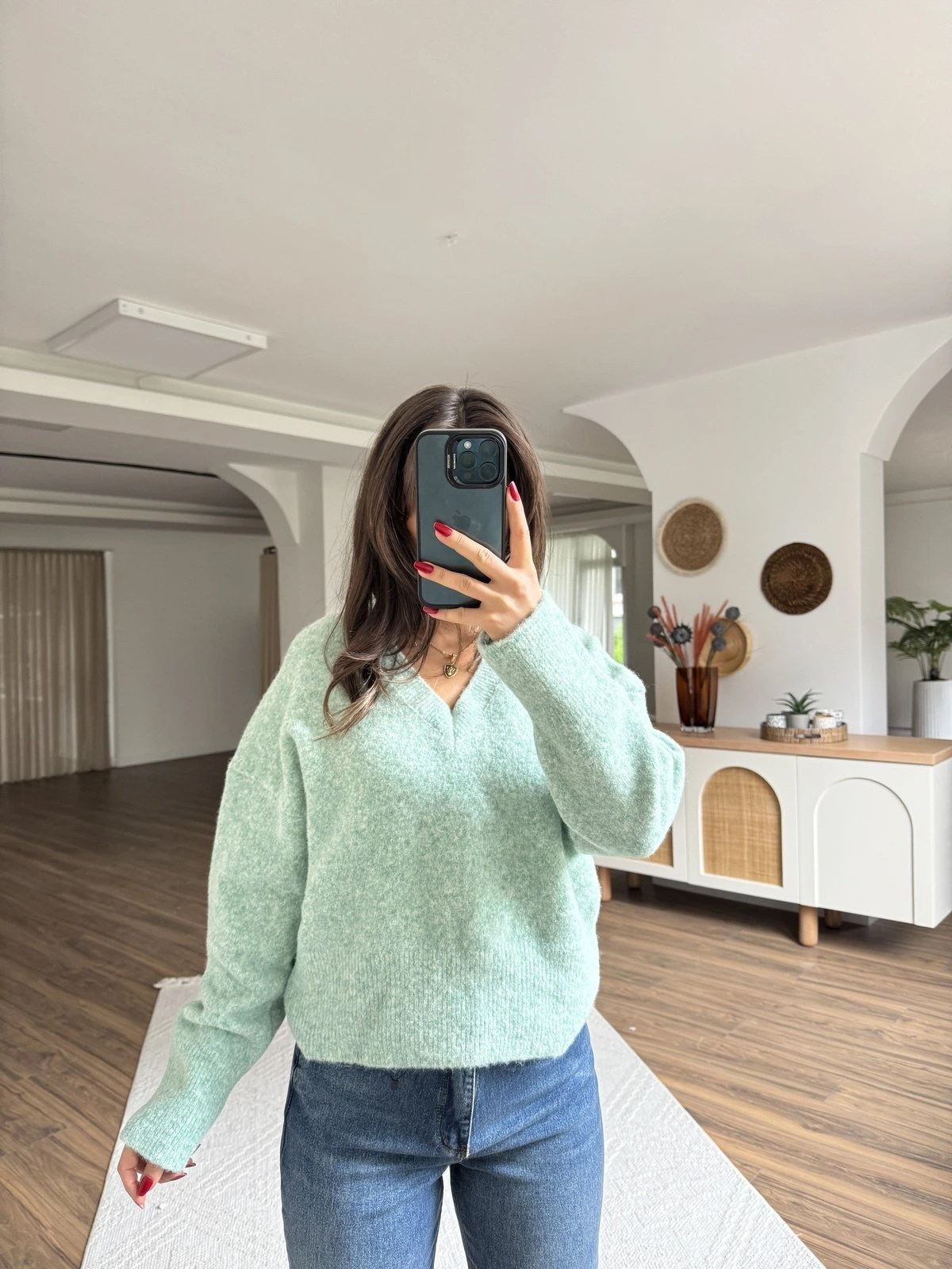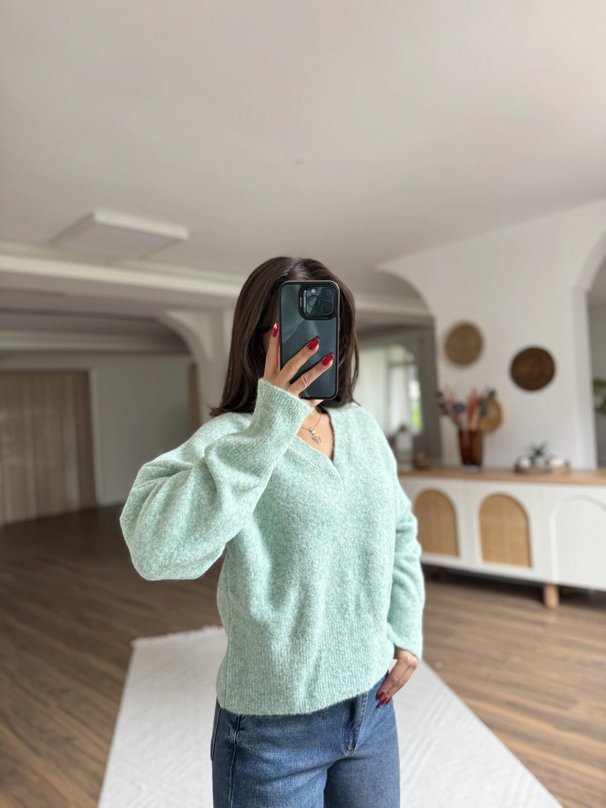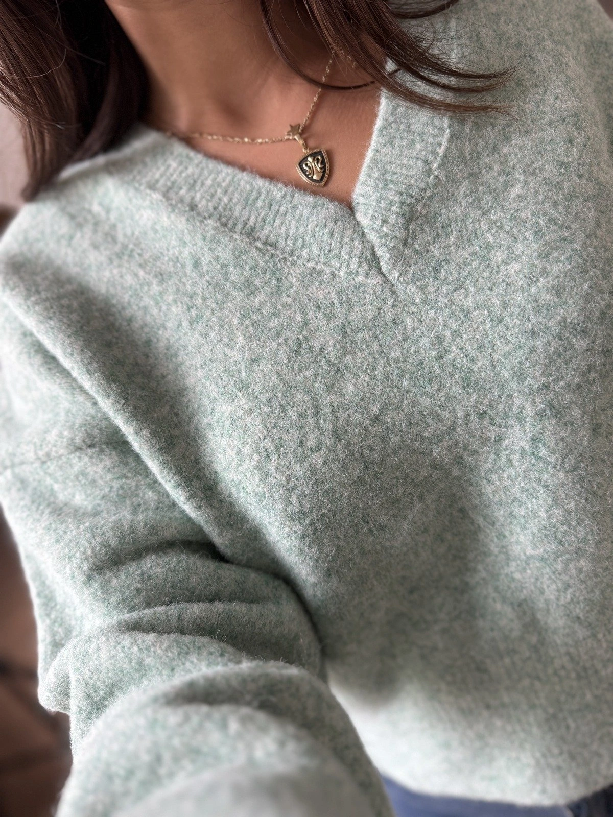 V YAKA YUMUŞAK DOKU YÜN KARIŞIMLI DÜŞÜK OMUZ KAZAK – MİNT YEŞİLİ