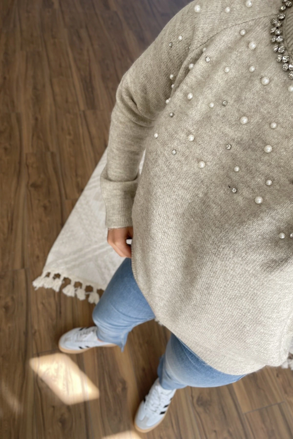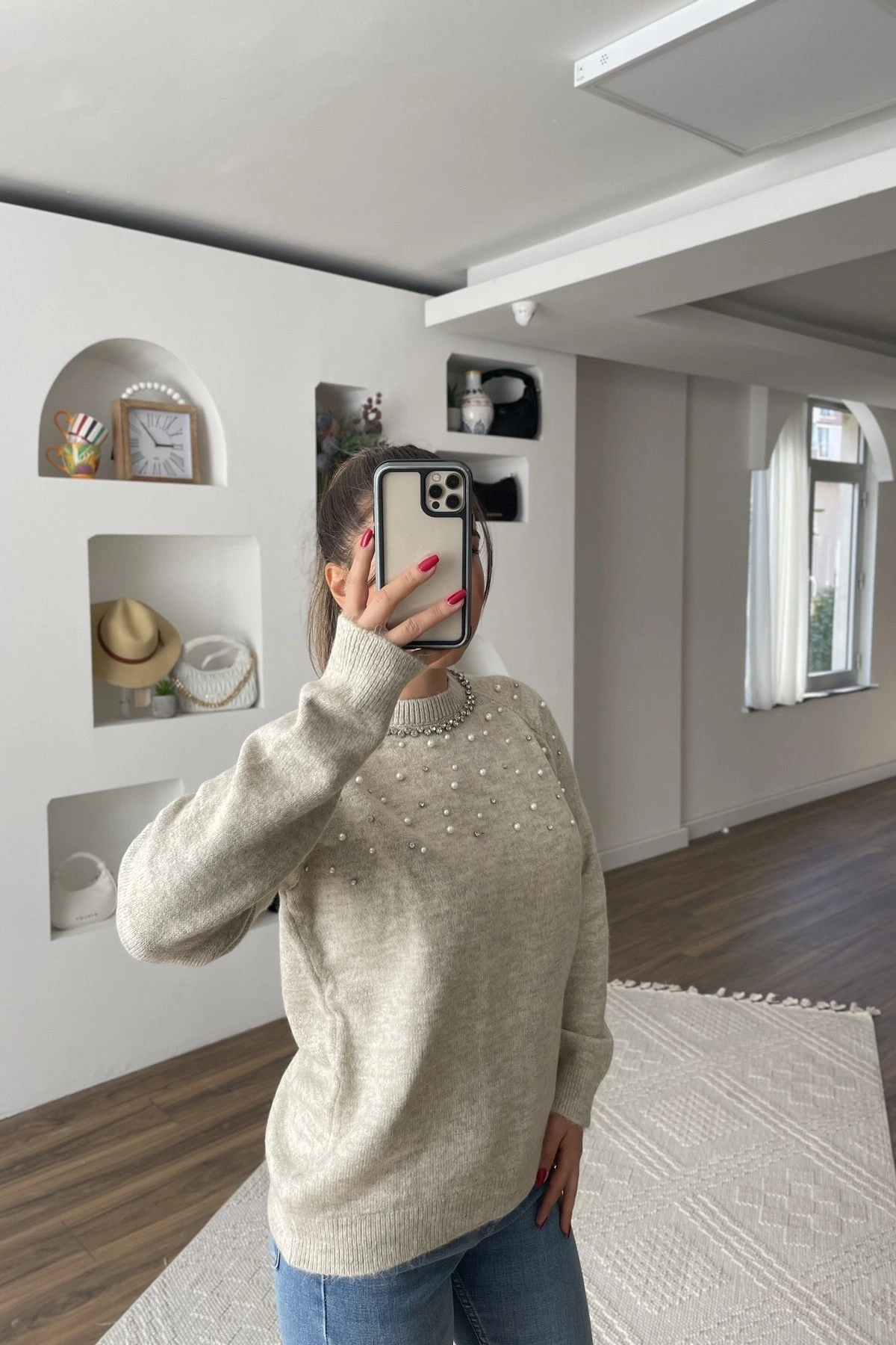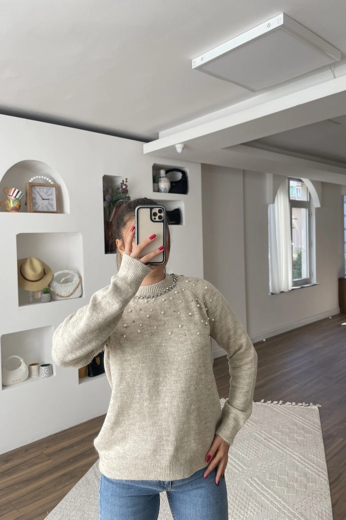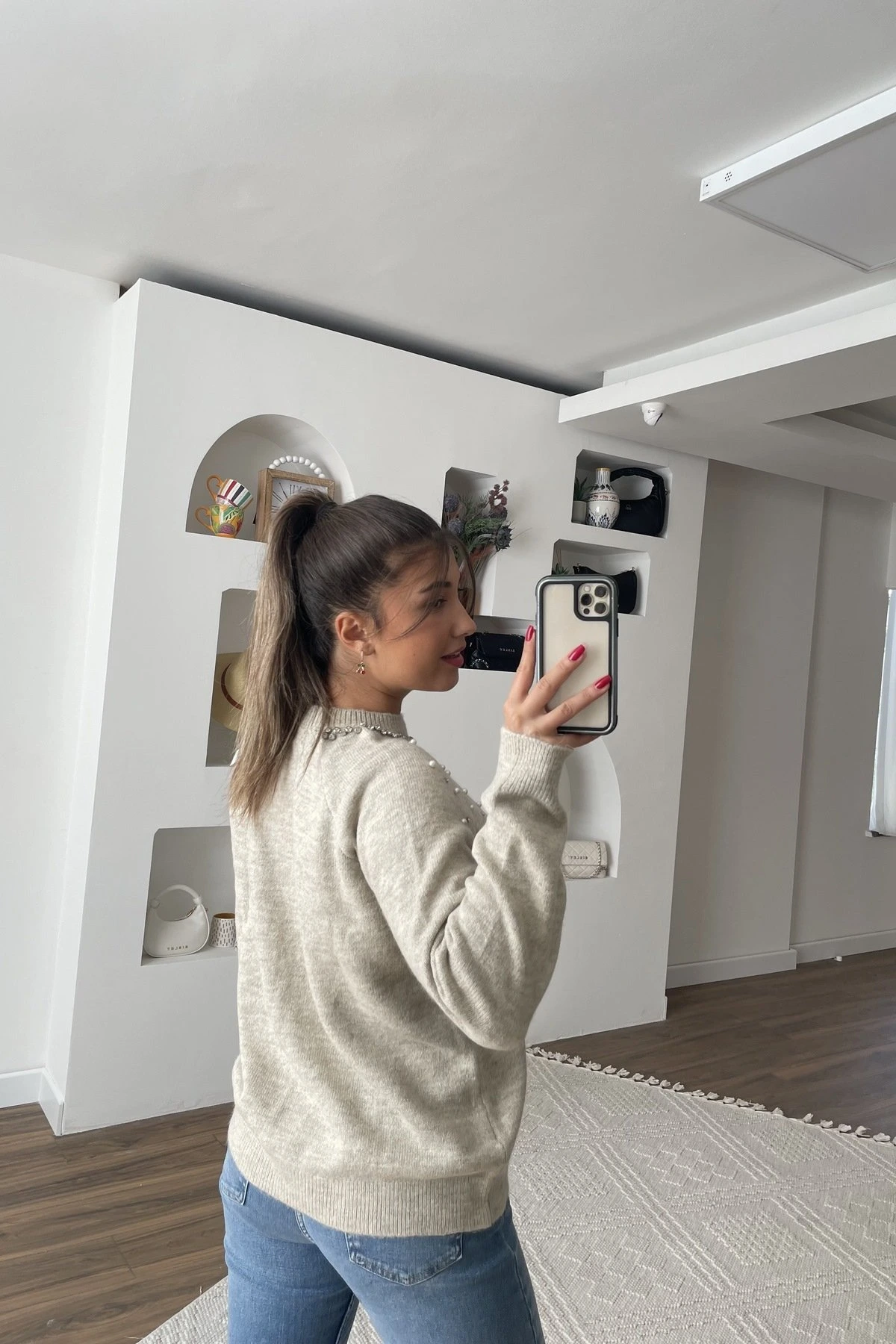 YAKA SIRA TAŞ ÇAKIM İNCİ SERPME KAZAK – AÇIK BEJ