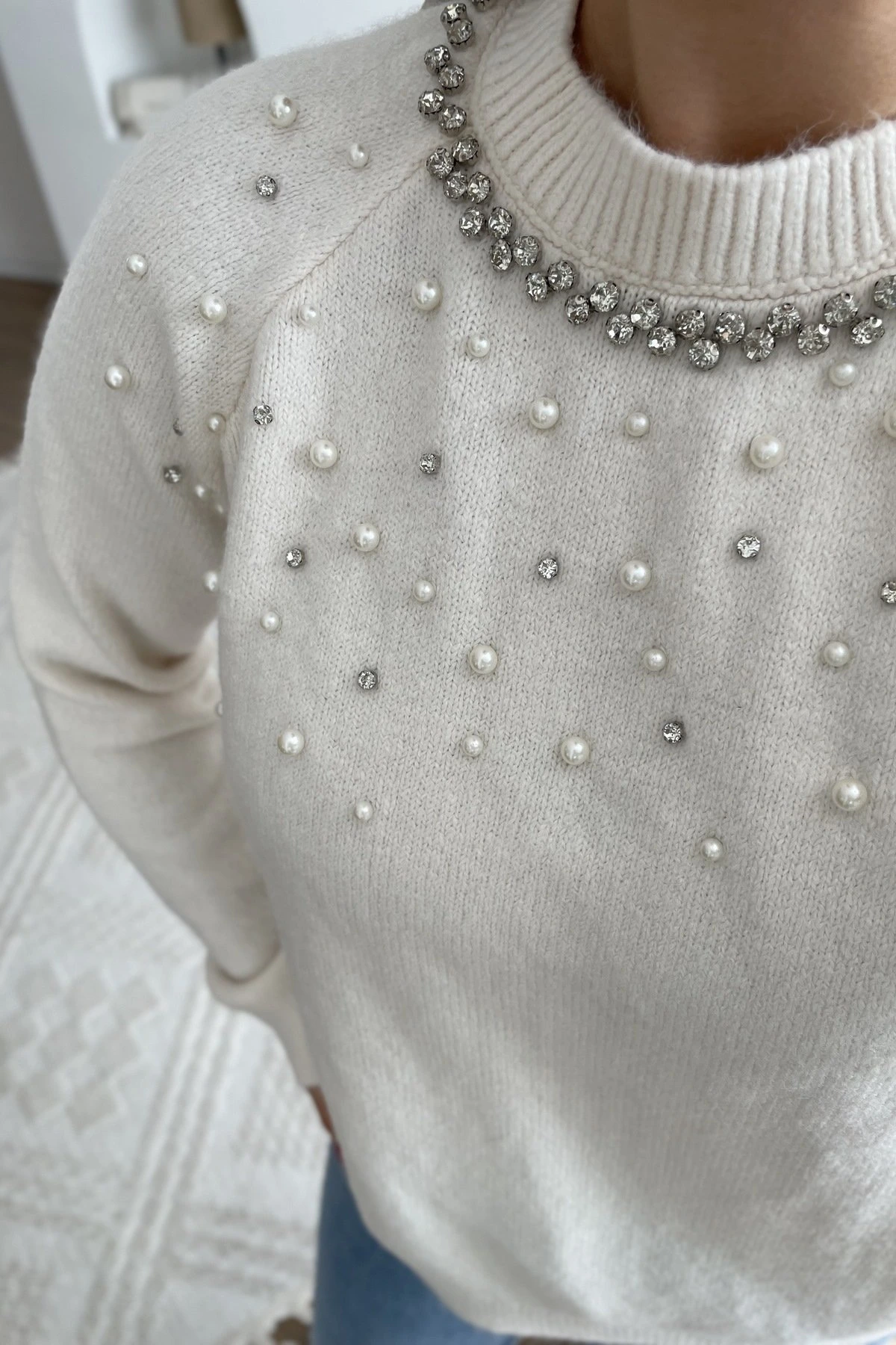 YAKA SIRA TAŞ ÇAKIM İNCİ SERPME KAZAK – KREM