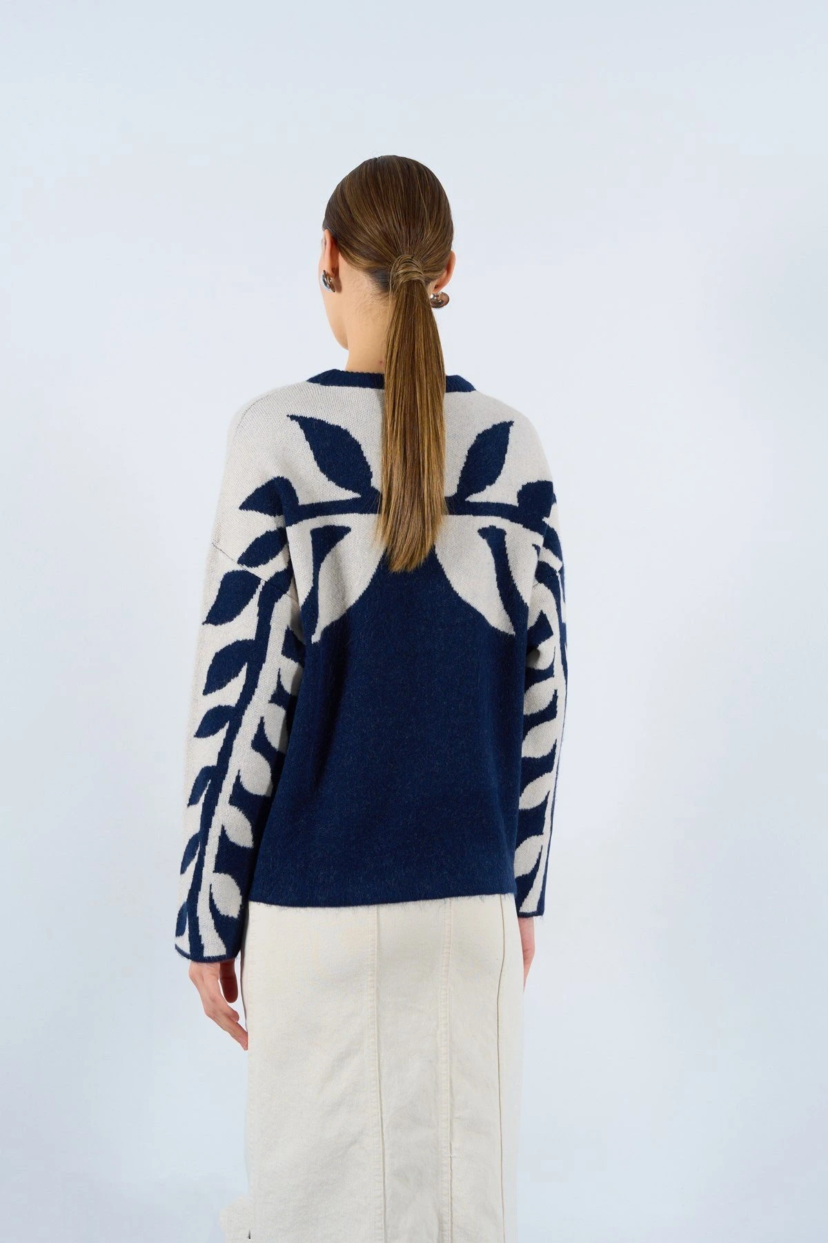 YAPRAK DESENLİ BİSİKLET YAKA AKZAK – LACİVERT