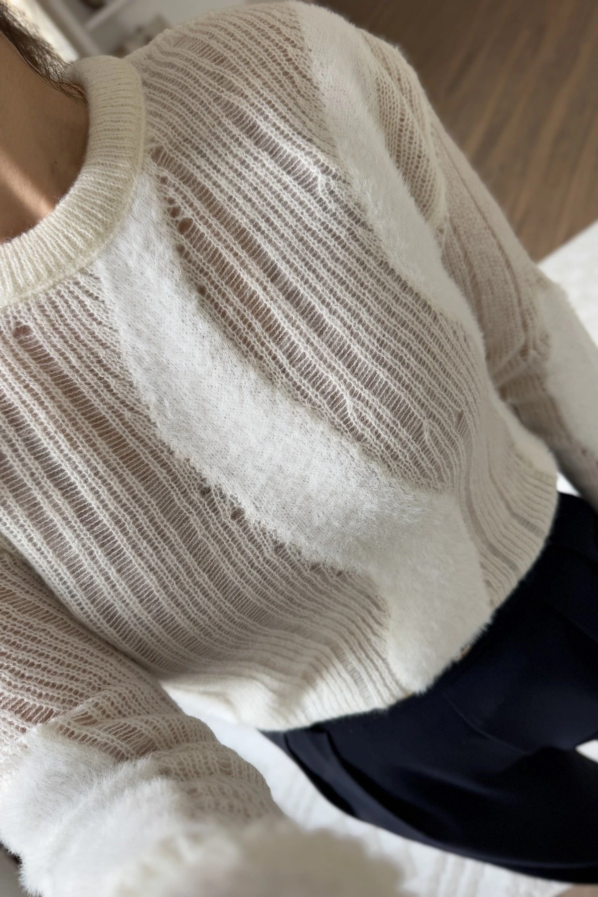 YUMOŞ ŞERİT DETAY AJURLU TRİKO – EKRU