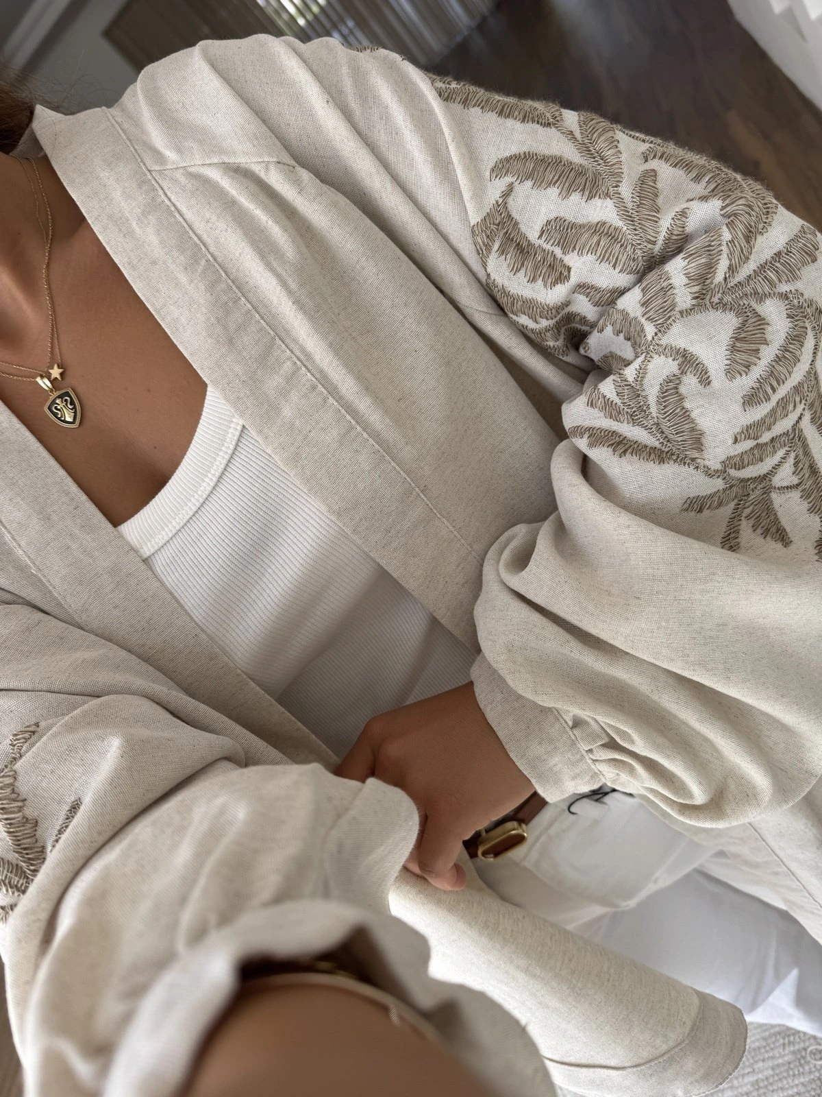 KELEBEK PUL İŞLEME VİSKON KETEN KİMONO - NATUREL