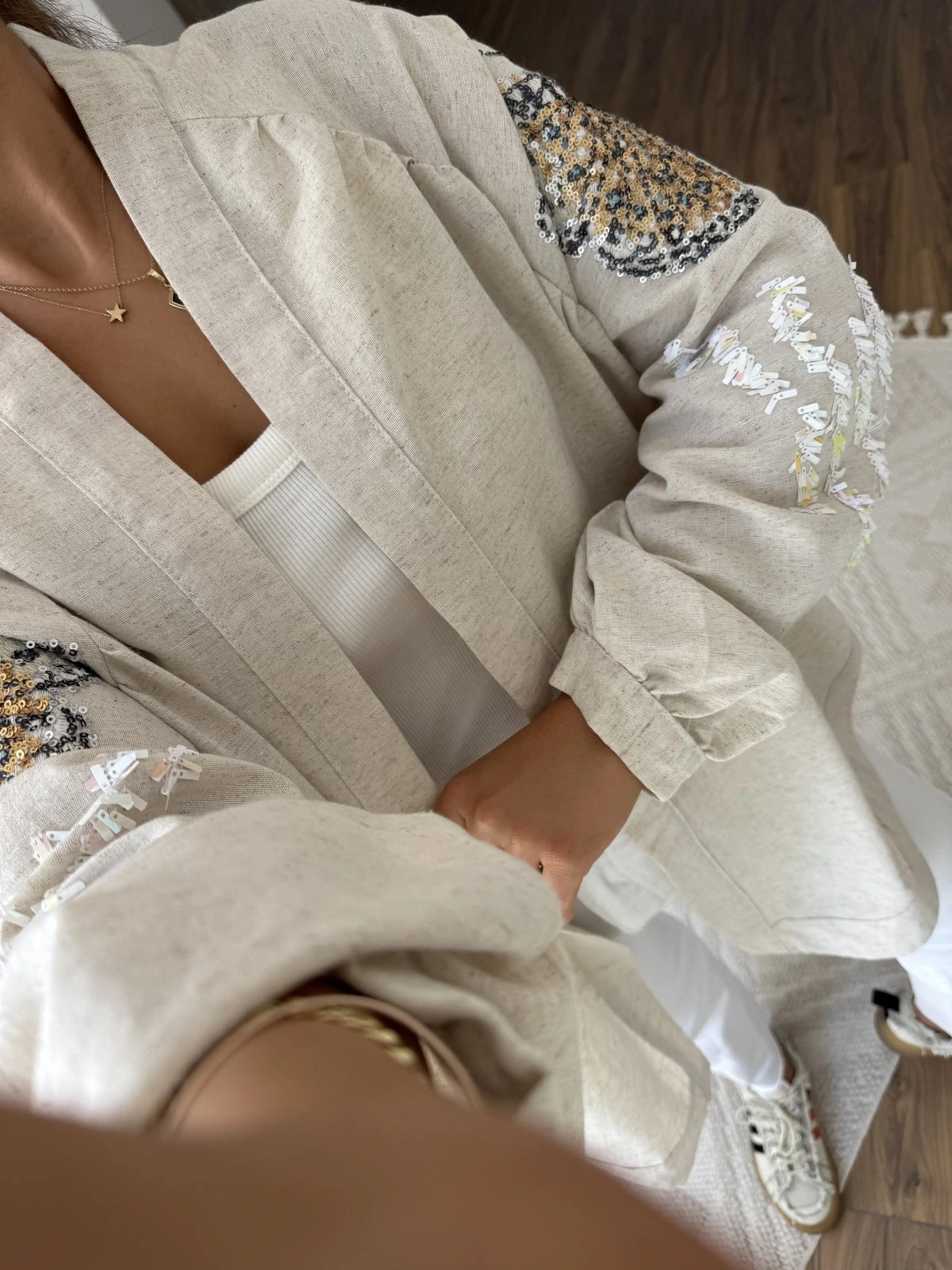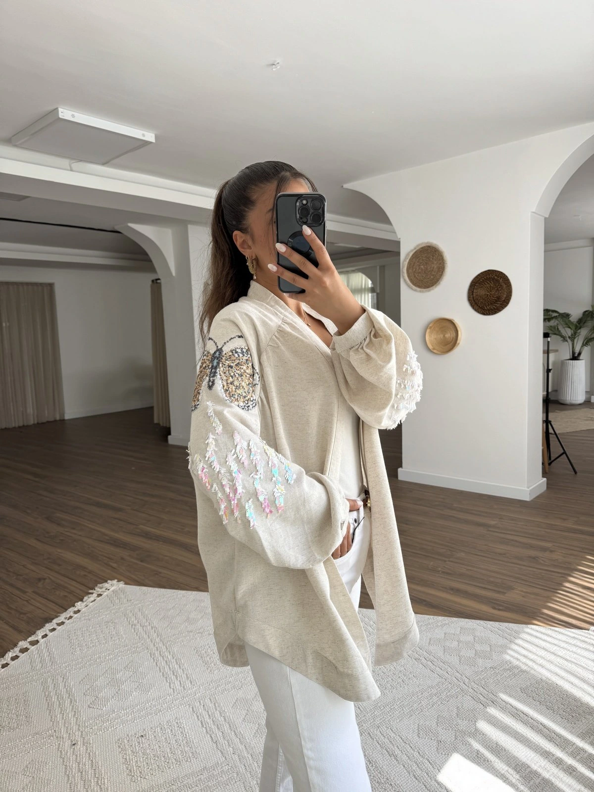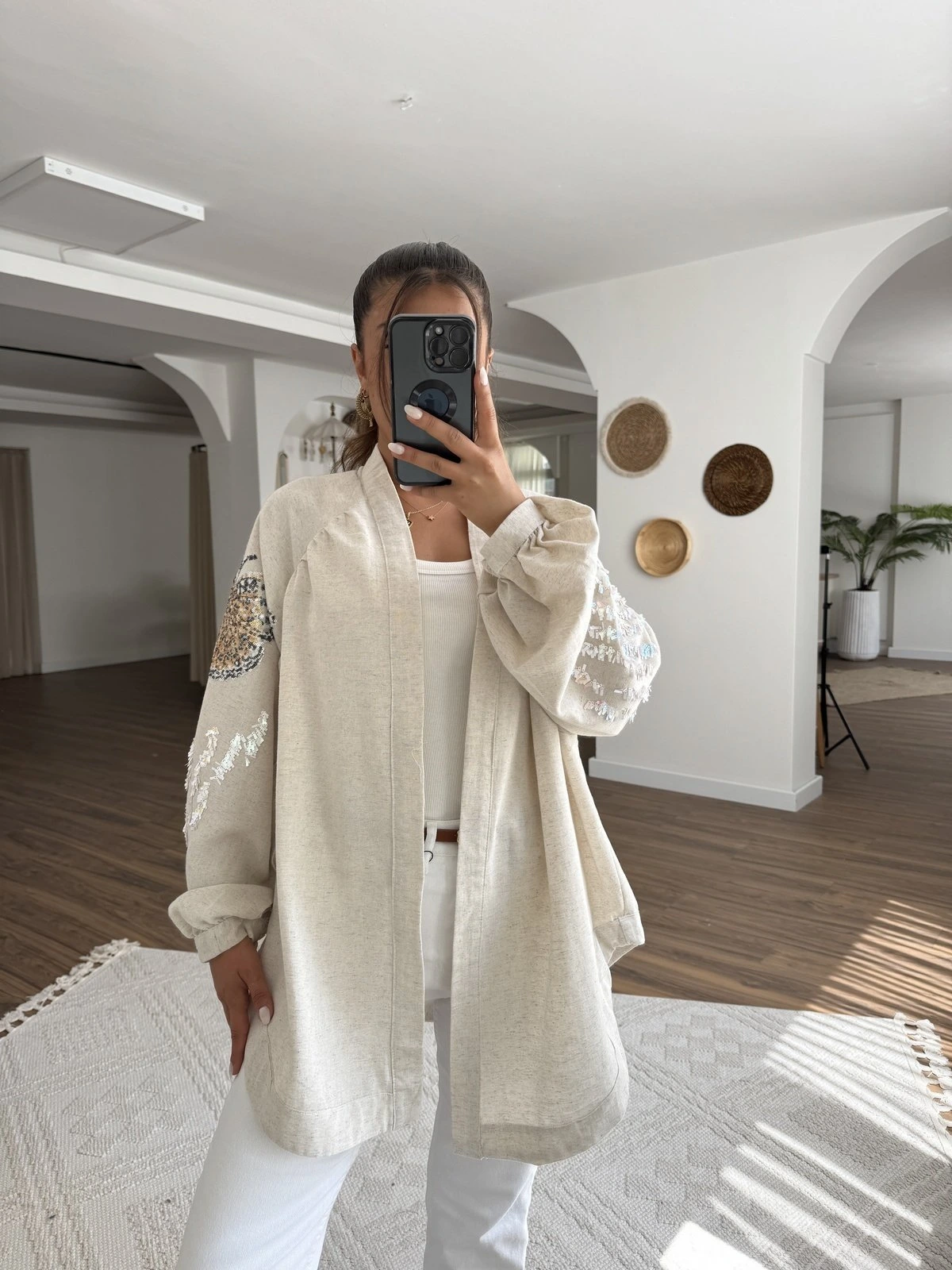KELEBEK PUL İŞLEME VİSKON KETEN KİMONO – NATUREL