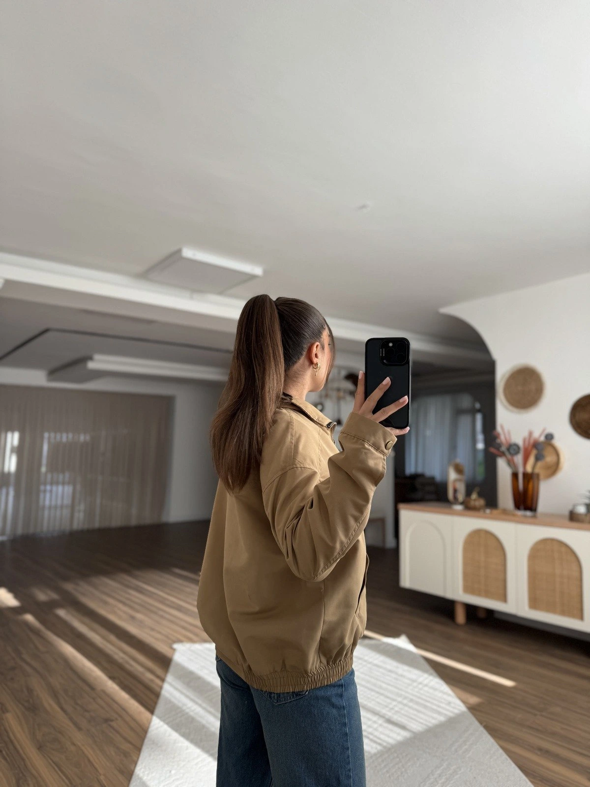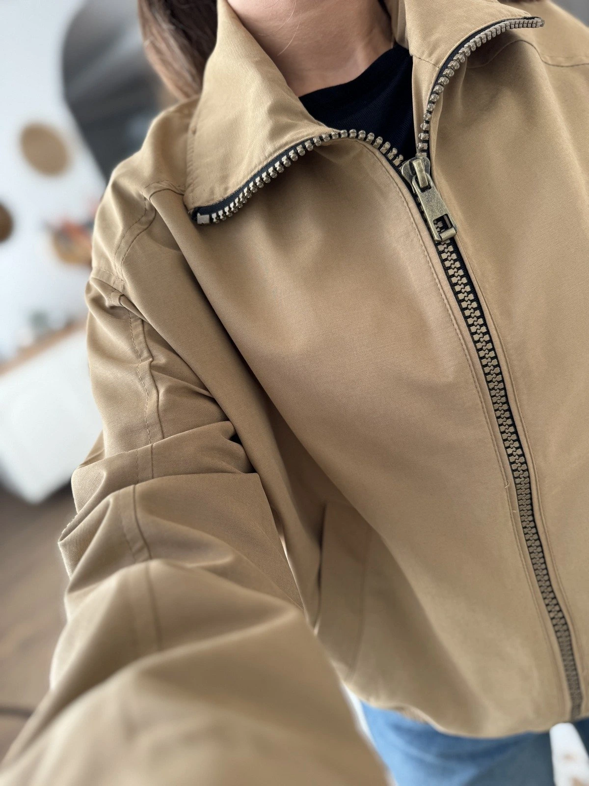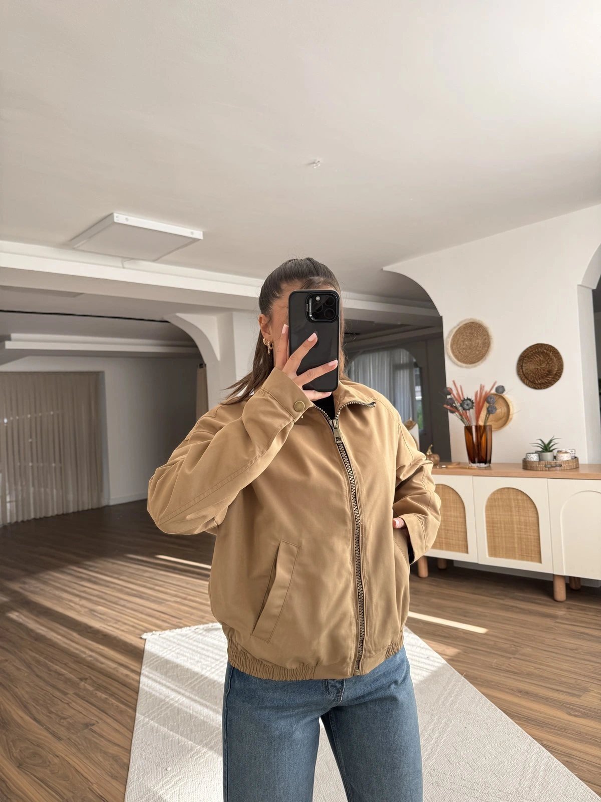 DİK YAKA GENİŞ FERMUAR ASTARLI BOMBER İNCE MONT – CAMEL