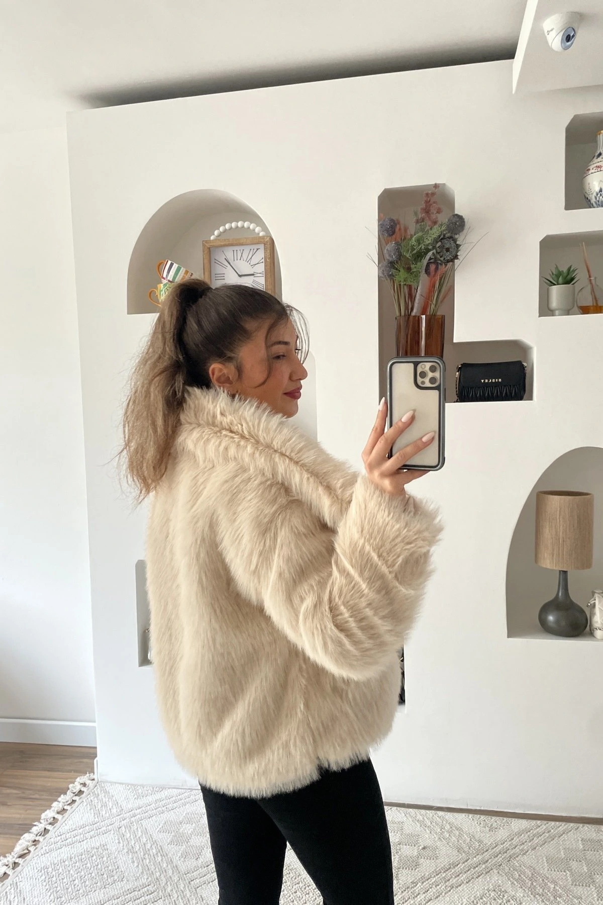 İÇ SATEN ASTARLI ÇITÇITLI GENİŞ YAKA CEPLİ KÜRK MONT – BEJ