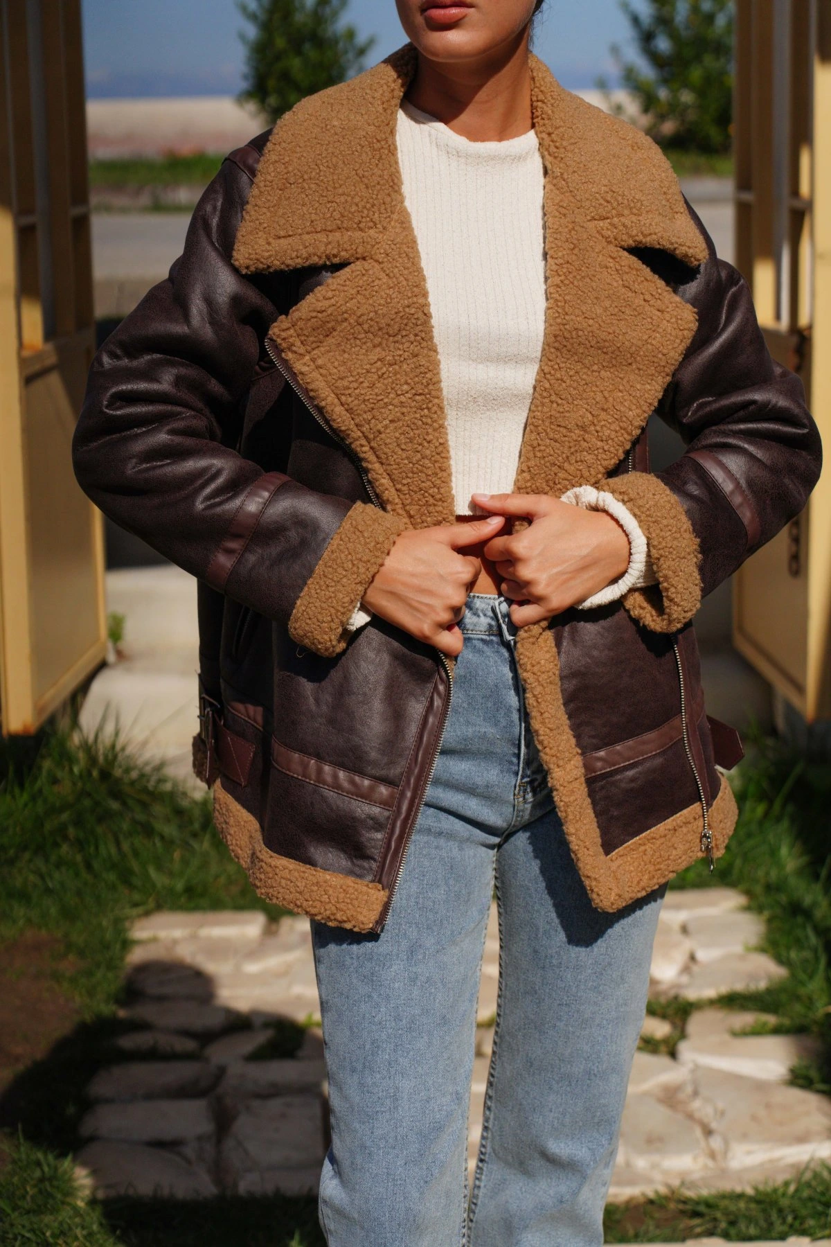 İÇİ KÜRKLÜ ŞERİT DETAY DERİ BİKER MONT – KAHVE