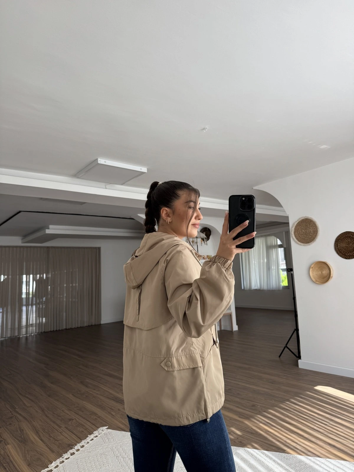 KAPÜŞONLU BEL BÜZGÜ DETAY İNCE YAĞMURLUK – A.CAMEL