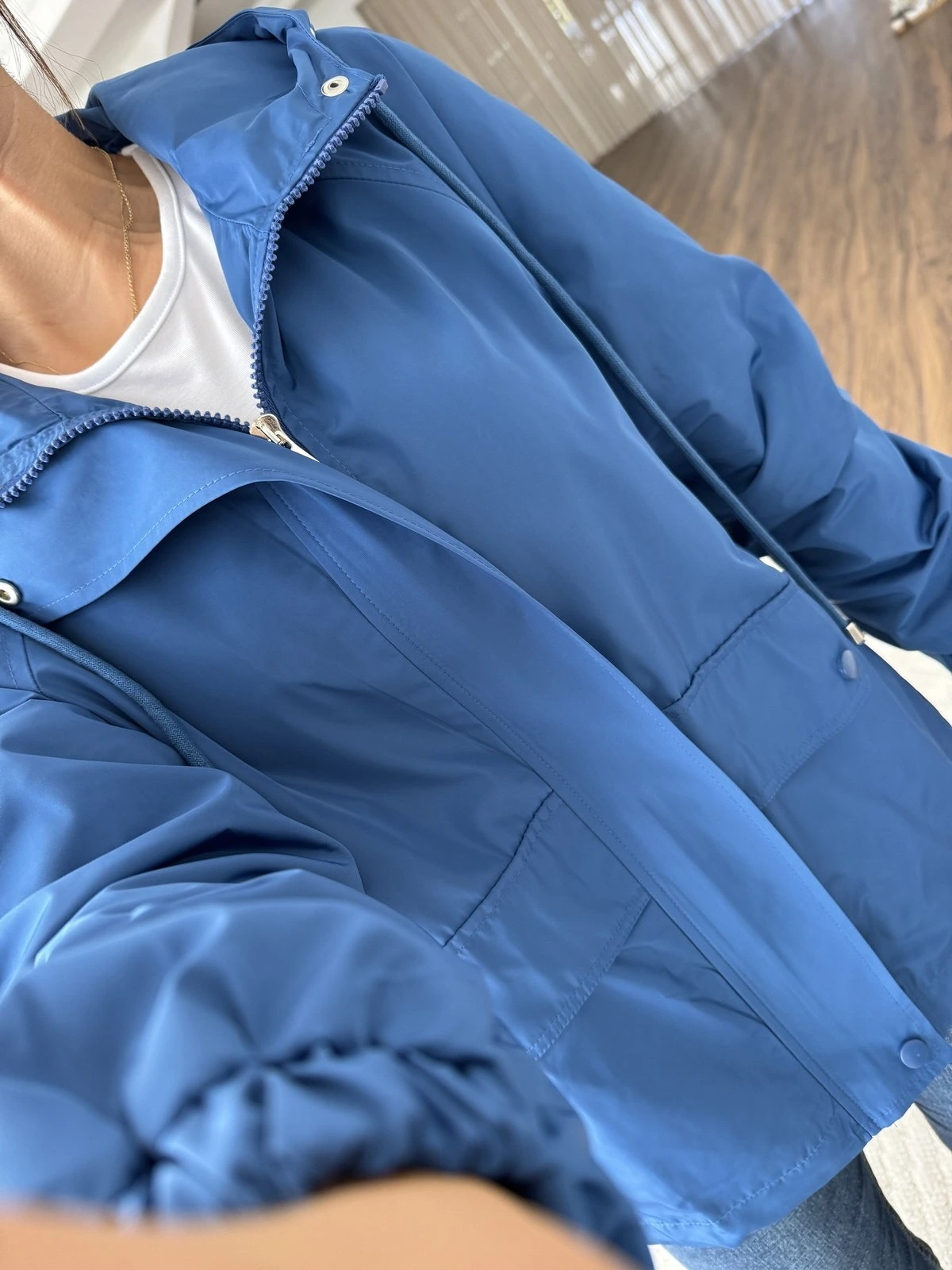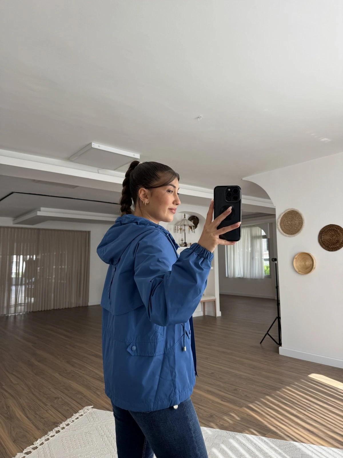 KAPÜŞONLU BEL BÜZGÜ DETAY İNCE YAĞMURLUK – İNDİGO